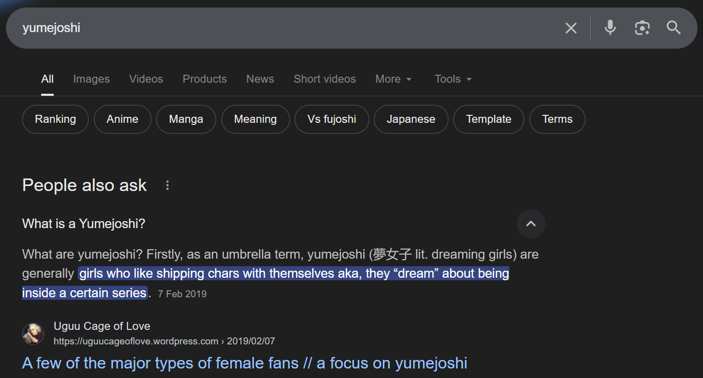 >>558272881Not all femcels are yumes though. Yumes are basically waifufags/husbandofags. I've ever heard of yumes who somehow have partners even though it makes you question if they love their yume target more than their partner themselves. Personally I don't think I could ever love a real person more than the characters I yume for and I don't want to put someone through that kind of emotional turmoil.