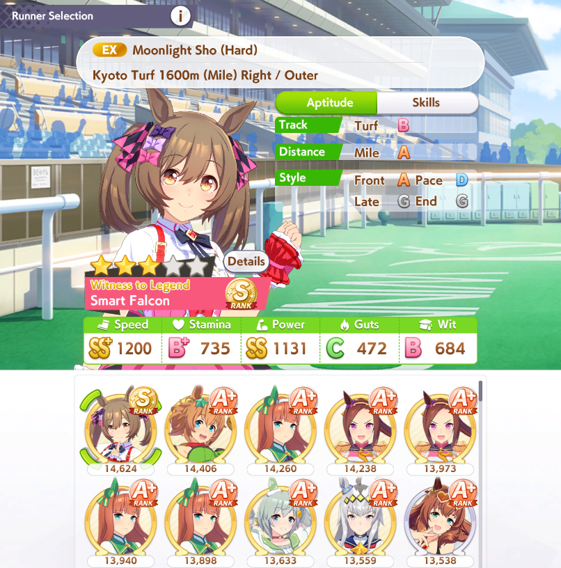 >>558273943But for Sprints was easier, you just use wits and speed cards because Wits increses Speed, and Speed increses Power, Wits also doesn't consume Energy.In Mile i have to focus on Stamina too.Unless i have Stamina based parents.