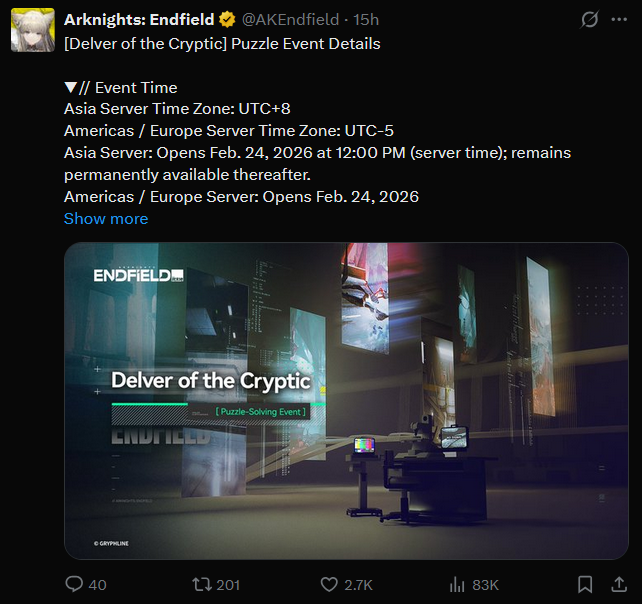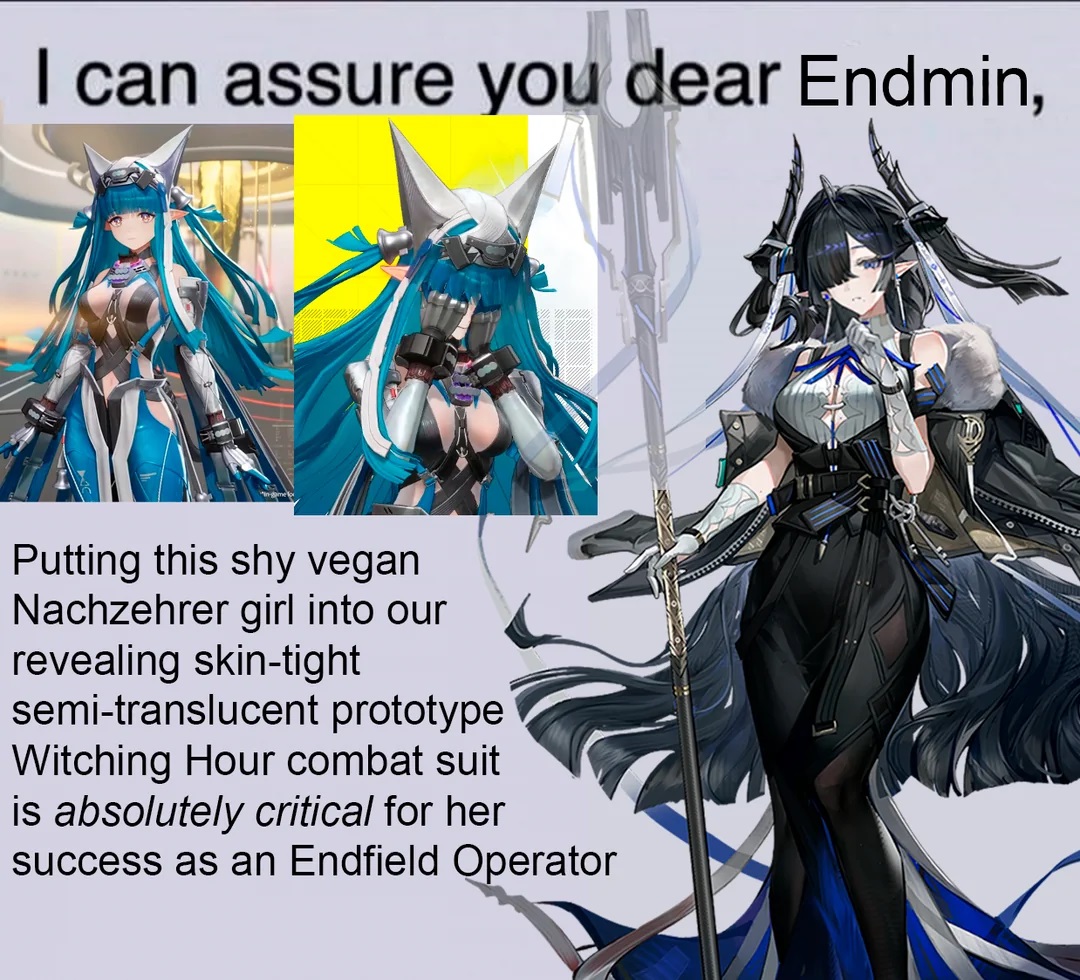 el filterado retardoPrevious thread: >>558248557>Official Websitehttps://endfield.gryphline.com/en-us>Official EN X (News)https://x.com/AKEndfield>DEV Comm (Developer Updates)https://endfield.gryphline.com/en-us/news/3846>Gilberta PV'shttps://www.youtube.com/watch?v=8hZVxeiSmQ4 - EP [Snap Shot]https://www.youtube.com/watch?v=BQom1V9TdbM - Operator Storyhttps://www.youtube.com/watch?v=h70w5ZmXLkE - Combat Demo>Chartered Headhunting ScheduleFebruary 7th to February 24th --- "The Floaty Messenger", (Gilberta)February 24th to March 13th --- "Hues of Passion", (Yvonne)TBA>Reward CodesENDFIELDGIFTENDFIELD4PC>Twitch Dropshttps://endfield.gryphline.com/special/third-party-binding?channel=twitch>Voyage to the Stars (Ongoing until March 4th)https://endfield.gryphline.com/activity/voyage-to-the-stars/en-us/>Wikishttps://wiki.skport.com/endfield (Official)https://perlica.moehttps://warfarin.wiki/enhttps://endfield.wiki.gg/>Blueprint Guideshttps://talospioneers.com/en>Stickershttps://drive.google.com/drive/folders/13KH3L6QPIKkVH7pBddv4uxwmwJsnOtklhttps://drive.google.com/drive/folders/1OuVtjv1k-9c3M6n7d4PX3CGG5bkwH04ahttps://drive.google.com/drive/folders/1AStB8bzFk3lSwMwczWPkFYCBrZe0vHOghttps://drive.google.com/drive/folders/1yS0lqUhxf8tBRtpDFfCU1y16IS2sSeF7>Fr/end/sSubmit your info, /end/min:https://forms.gle/Fo7BhZMKaKqiWyL19View other /end/mins:https://docs.google.com/spreadsheets/d/1YtxiDss0hgEQhLlZgpfzyGrJrzUcqDzOS9T6IH-BiVc/edit?usp=sharing