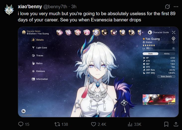 How retarded would it be to pull for Yao and Sparxie in the hope that they're useful for Silver Wolf SP's team?Otherwise maybe I'll just get Evernight for my Castorice and slowly build out that team with reruns while waiting for Elation to take shape.