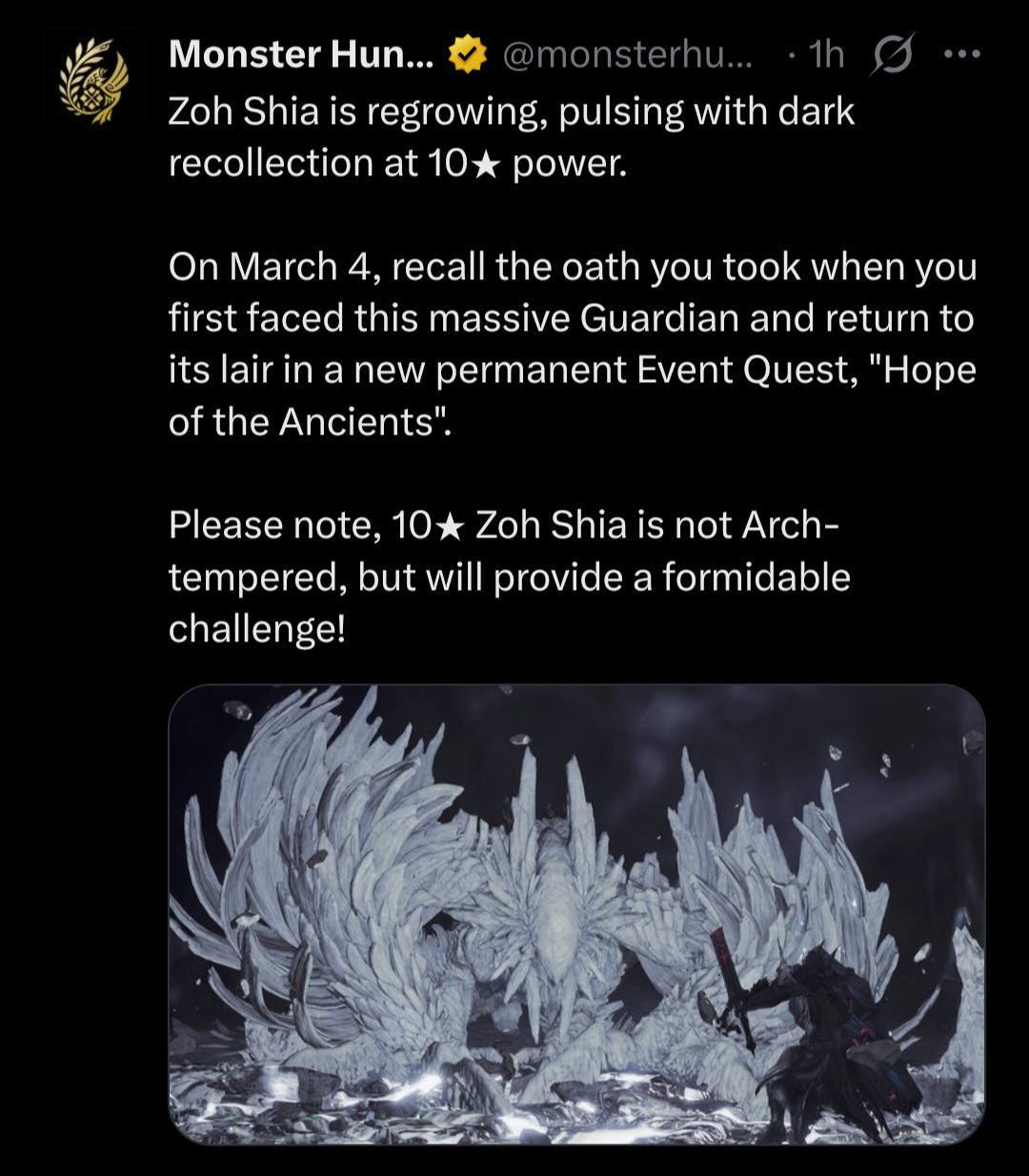 BUY HIS GAME>I have a question about Monster Hunter!https://pastebin.com/D3zuHuqK >MH Stories 3: Twisted ReflectionRELEASE DATE: MARCH 13, 2026Official Website: https://www.monsterhunter.com/stories3/en-us/Steam Store: https://store.steampowered.com/app/2852190/Monster_Hunter_Stories_3_Twisted_Reflection/Announcement Trailer: https://www.youtube.com/watch?v=XszCdDNI-lsIntroduction Video: https://www.youtube.com/watch?v=ps6yAI5THmMHabitat Restoration Trailer: https://www.youtube.com/watch?v=764b4_5dZJgGameplay Video: https://www.youtube.com/watch?v=6JDesEGUuO4 >MH WildsAT ARKVELD: FEBRUARY 18, 2026Wilds Info: https://www.monsterhunter.com/wilds/en-us/Steam Page: https://store.steampowered.com/app/2246340/Monster_Hunter_Wilds/Event Quest Schedule: https://info.monsterhunter.com/wilds/event-quest/en-us/scheduleTU4 Trailer: https://www.youtube.com/watch?v=Aijx69md9pUTU4 Changes: https://info.monsterhunter.com/wilds/update/en-us/Ver.1.040.00.00.html/mhg/ Persistent Lobby Info: https://i.imgur.com/M7MmPid.jpeg >MH WorldWorld on Steam Store: https://store.steampowered.com/app/582010/Monster_Hunter_World/Iceborne on Steam Store: https://store.steampowered.com/app/1118010/Monster_Hunter_World_Iceborne/General Info: https://pastebin.com/PKeD8Smg >MH RiseRise on Steam Store: https://store.steampowered.com/app/1446780/MONSTER_HUNTER_RISE/ Sunbreak on Steam Store: https://store.steampowered.com/app/1880360/Monster_Hunter_Rise_Sunbreak/General Info: https://pastebin.com/rewGysVq >Older Game Emulation and Multiplayer/Frontierhttps://pastebin.com/fYyeU0kY >Databaseshttps://kiranico.com/ >Where does /vg/ play?/mhg/ has its own squad in Wilds: RL9XQ7VMPost the game, platform, room code, and password (7243/rage) >/mhg/ OP Template (use this when making new threads)https://pastebin.com/K3FHwGpr Previous thread: >>558244615