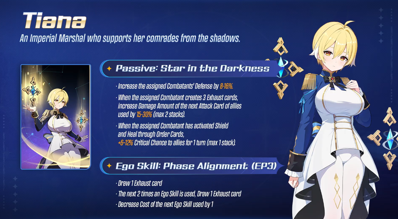 Probably like a Magna or Rei type character who do something for the team without really needing cards to do it. If I had to guess. Magna just works once you play her upgrades, and Rei can give you 35% multiplicative damage buff just by existing if you have her at e6 and play 3 Exhaust cards on her.
