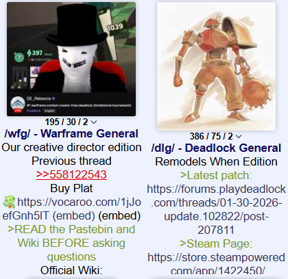 Remodels When Edition>Latest patch:https://forums.playdeadlock.com/threads/01-30-2026-update.102822/post-207811>Steam Page:https://store.steampowered.com/app/1422450/>Where to leave feedback and report bugs:https://forums.playdeadlock.com/>How do I git in?Post your Steam profile and ask. You need to accept a friend request to be invited, so don't be a sperg.>How do I git gud?Do the tutorial, get a feel for each hero in sandbox mode, explore public item builds, watch replays. Playing a Hero for the first time will put you into a lower rank game*, so don't worry about it too much.Additional Resources:>Unofficial Wikihttps://deadlock.wiki>Collection of useful character buildshttps://deadlockmeta.com/>New Player Guidehttps://docs.google.com/document/d/1lMBE7Nli_sVJ42d-kPHjF3MBaXZdIM46gNJQC_fMGMU/edit>Advanced Movement Guidehttps://www.dlmovement.wiki/>Unofficial Stat Tracker (Unreliable due to API rate limits)https://statlocker.gg/https://tracklock.gg/>Unofficial Competitive Newshttps://www.deadfrag.com/>Unofficial Voiceline Viewerhttps://deadlock.vlviewer.com/Threadlocked: >>558279738