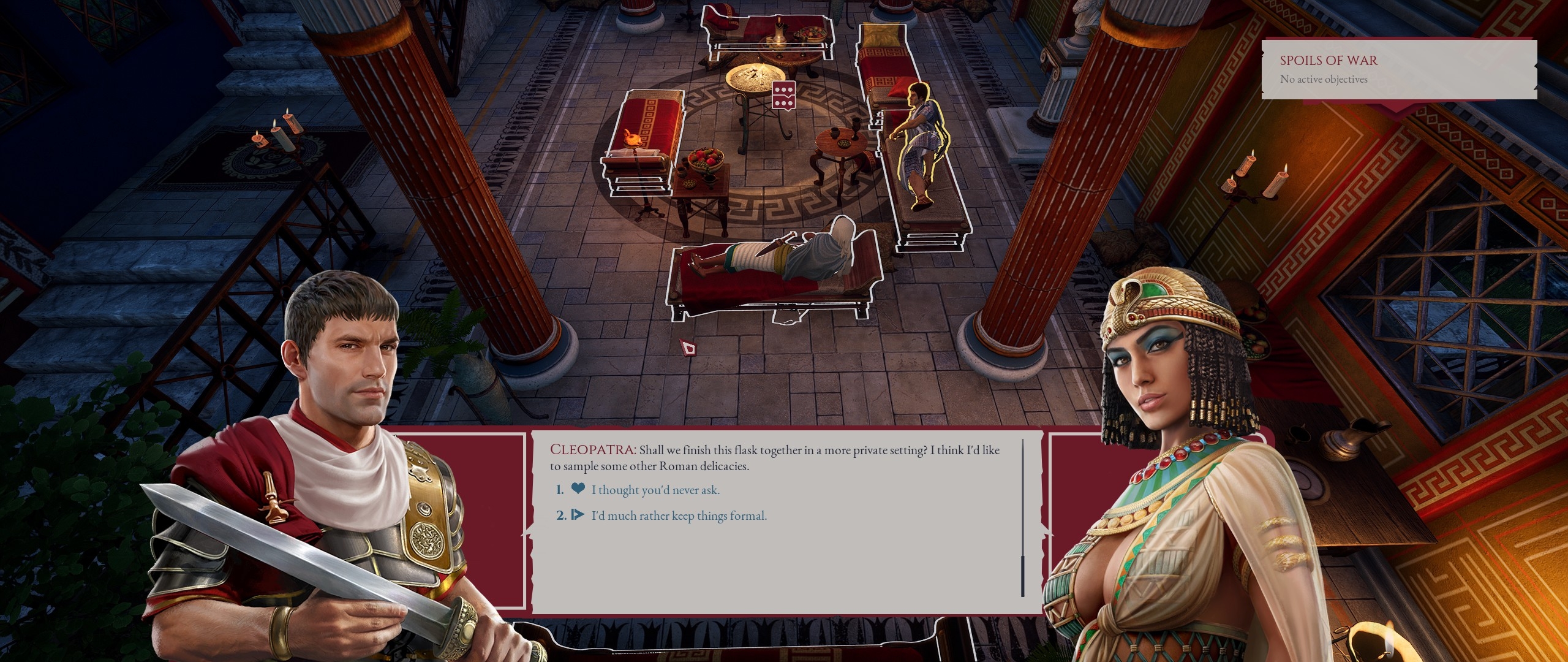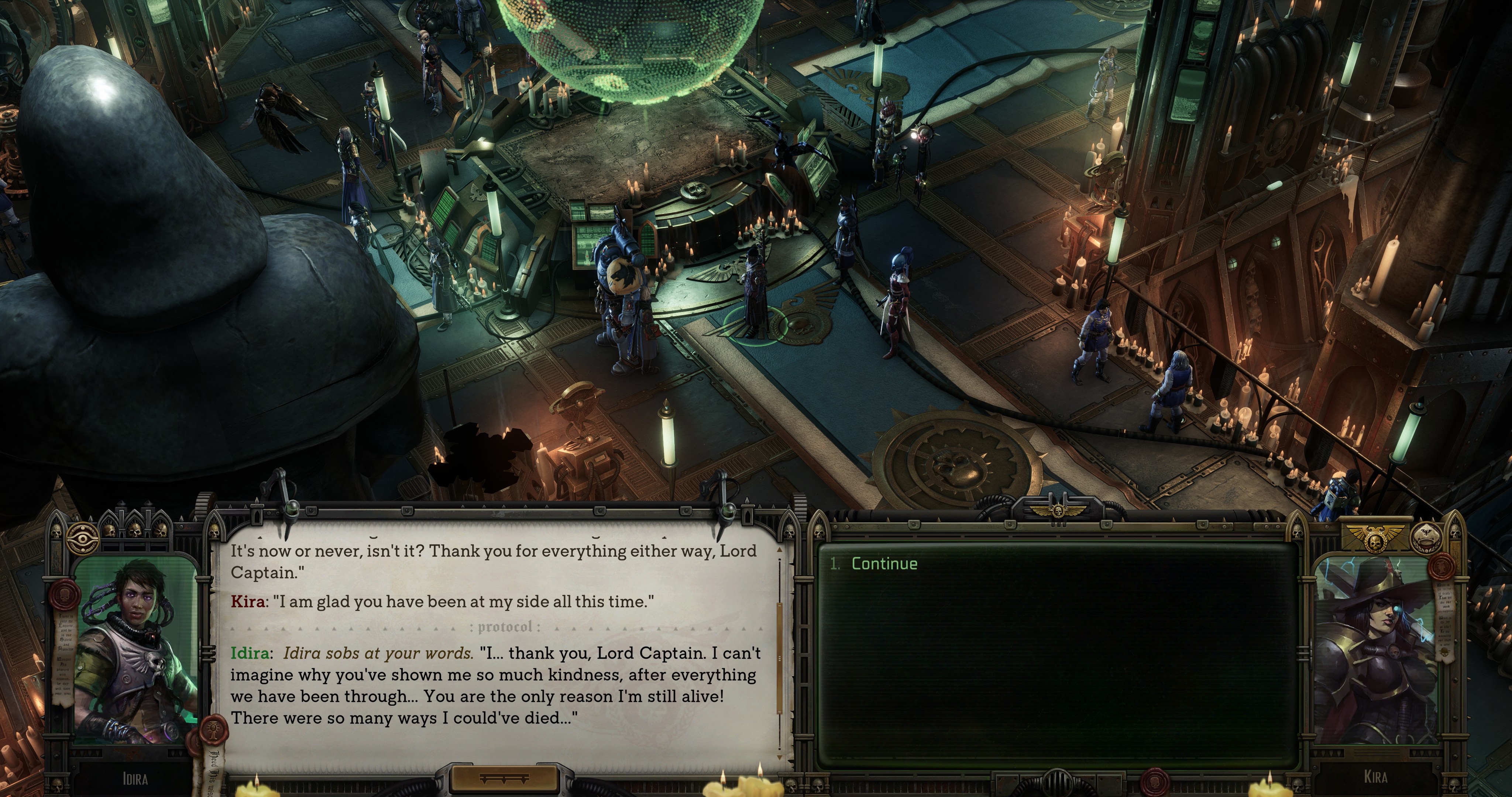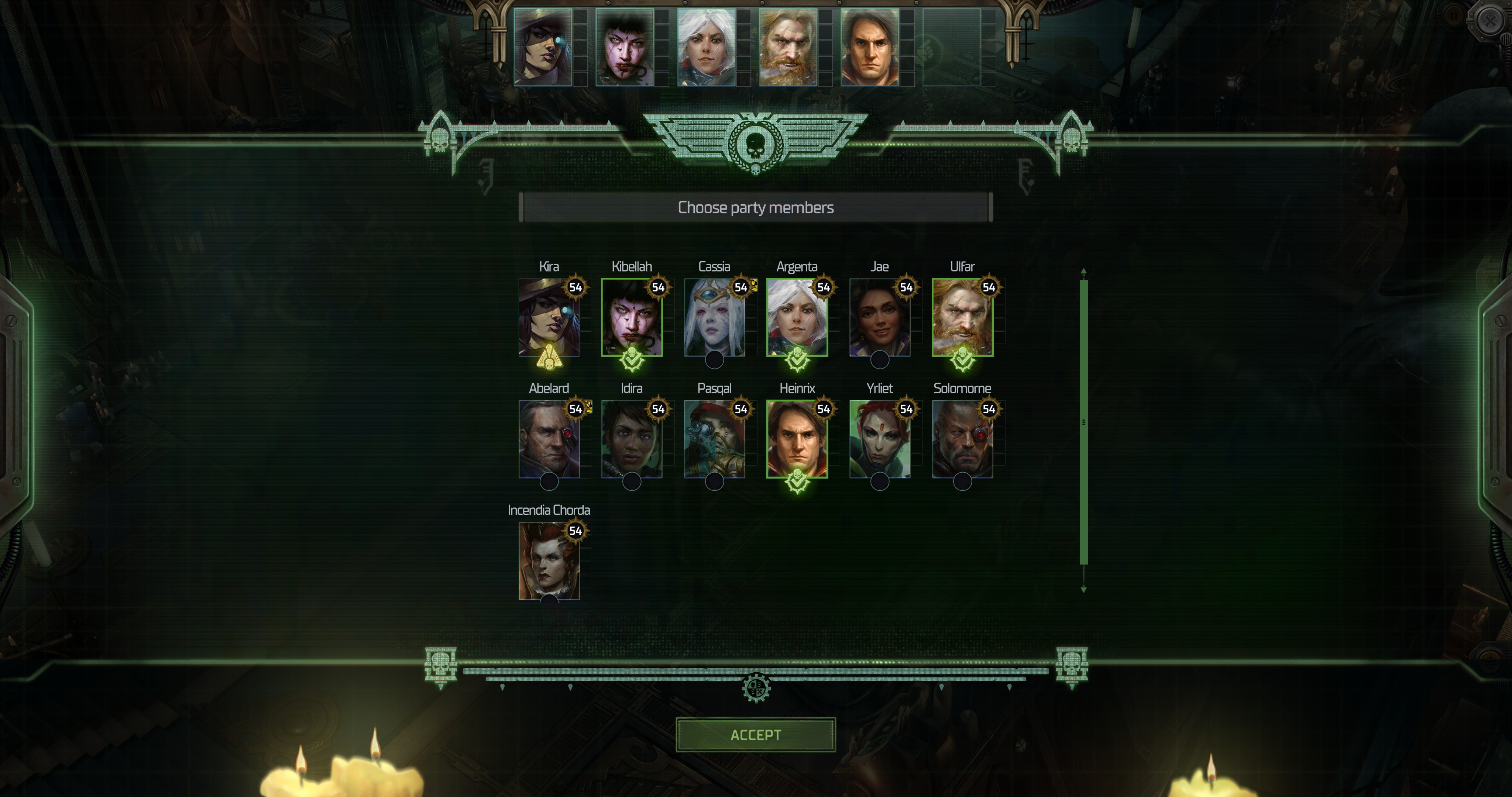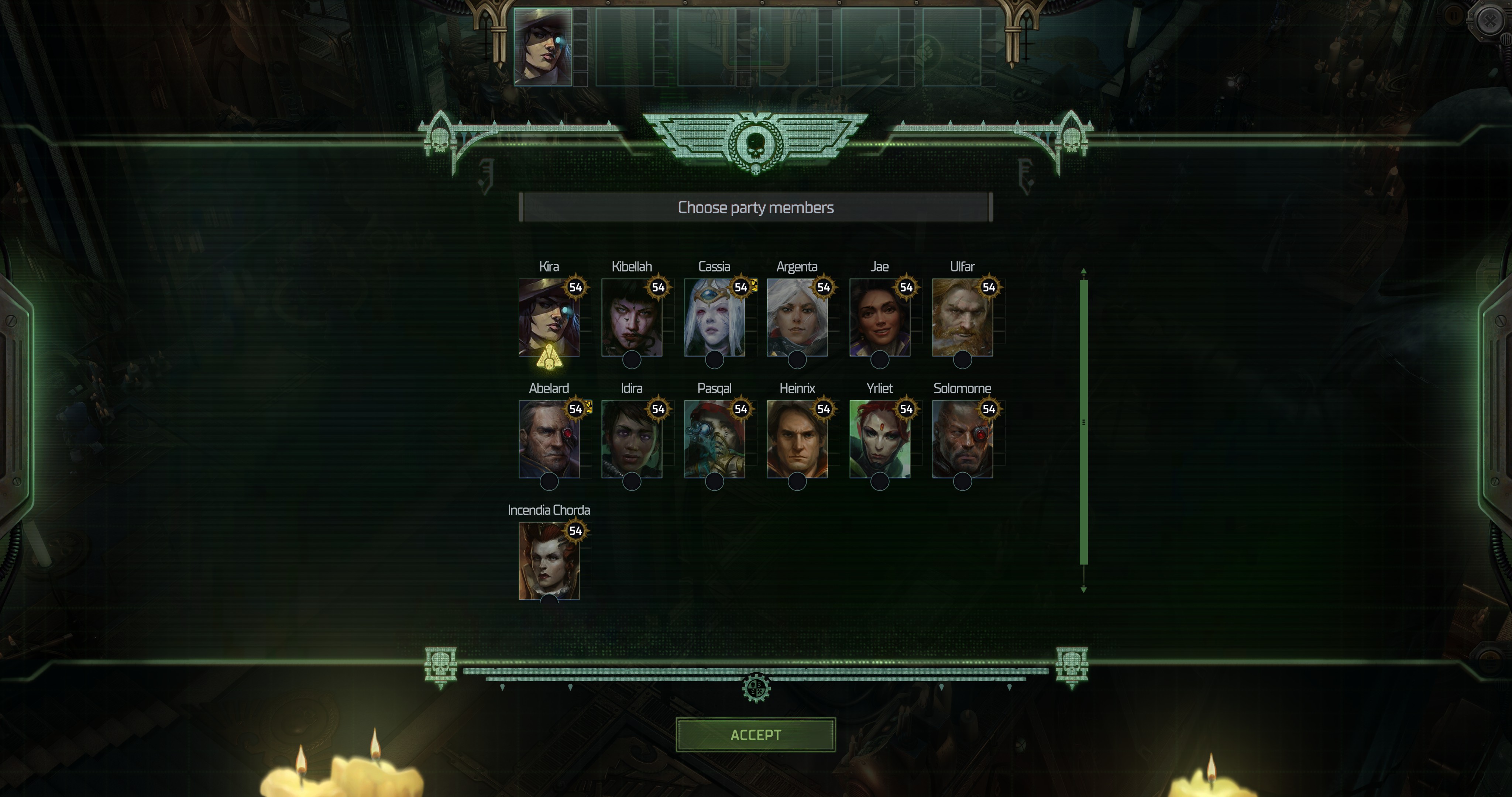 Good suggestions. So far I have my bodyguard who goes with me everywhere, the team mascot who goes everywhere, and the two people who have personal beef with Calcy so they can confront him.But we have one more spot. Normally I would take the skillmonkey and be done, but I don't recall many skillchecks at this stage. Cassia is also usually in the party, but since we honestly expect to die here I shouldn't take her since she has stuff to do. Tough choice.