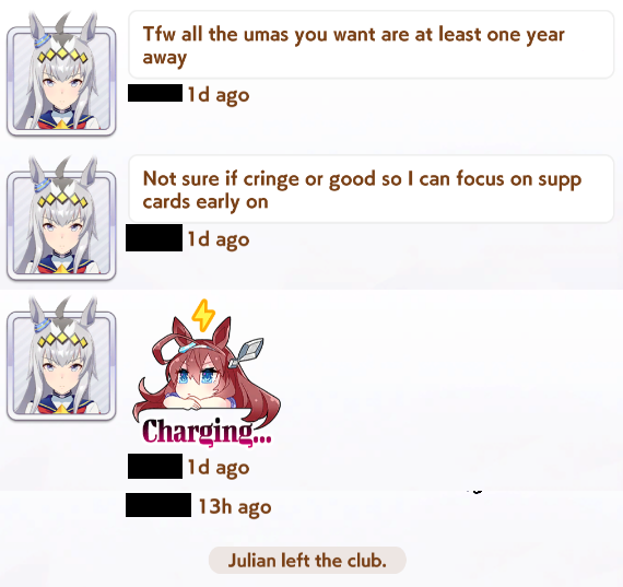 Previous: >>558317486>Global Game NewsLink your account to Cygames iDCurrent Scenario: Aoharu Hai aka "Unity Cup"Current Rate Up Trainee: Mihono Bourbon (3* alt), Eishin Flash (3* alt)Current Rate Up Support Cards: SSR Nishino Flower (Wit), SSR Sakura Bakushin O (Guts)Current CM: Aquarius Cup - Tokyo Turf 1600mMain Story Chapter 5 is out02/18 - 03/01 - Valentine Bourbon & Valentine Flash 3*+Nishino SSR+Bakushin SSR02/18 - 03/01 - The Peak of ConfectionEarly March - Aquarius Cup - Tokyo Turf 1600m Left-handed / Winter / Sunny / Firmhttps://umamusume.com/news/100040/https://pages.snep.pw/uma/anni-skill-changes/>JP Game NewsCurrent Rate Up: Royce & Royce (2*)New Scenario "Yukoma Hot Spring" releasedTimeline: https://uma.moe/timelineCygames Webstore: https://webstore.cygames.com/en/umamusume_en/>Thread Clubshttps://rentry.co/umaglobalclublistYou must be E3 (20k points) to join a circle. Apply with /uma/ or /vg/ in your profile or post ID in the thread.>All Guides & Resourceshttps://rentry.org/uma26Game databasehttps://gametora.com/umamusume (Click the gear to switch between JP / global server info)A basic guide for newfagshttps://rentry.org/umaglobalFind networks if your region is blocked from the game or clienthttps://www.umavpn.top/93Seiyuu & Concertshttps://rentry.org/umstUmamusume Birthday Calendarhttps://ウマ娘.攻略.tools/events/birthdayUma Texthttps://umareader.idsmile.xyz/
