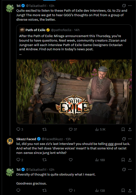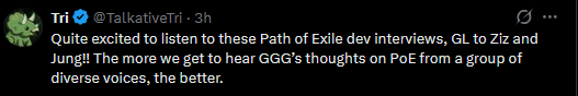 >ziz interview:>(gay voice) GGG, I'm a hardcore streamer, the game is really cooked right now, my 26k ES character, hardcore by the way, can't even stand in exarch runes for longer than a minute, this is just not FUUN and you need to make the game FUUUN for hardcore players so that we can play hardcore while talking to chat and wanking off Steelmage>jungroan interview>In light of the consternation of various subreddits, past, present and future, and having in mind the ubiquitousness of discontent with the state of ground loot, not ground loot per se, but loot from the ground par excellence, the sui generis for the genre of ARPGs, could you elucidate or perhaps hint at the subliminal design vectors you take into consideration when you managing the creative throughput with understandable yet frustrating limitations of staffing