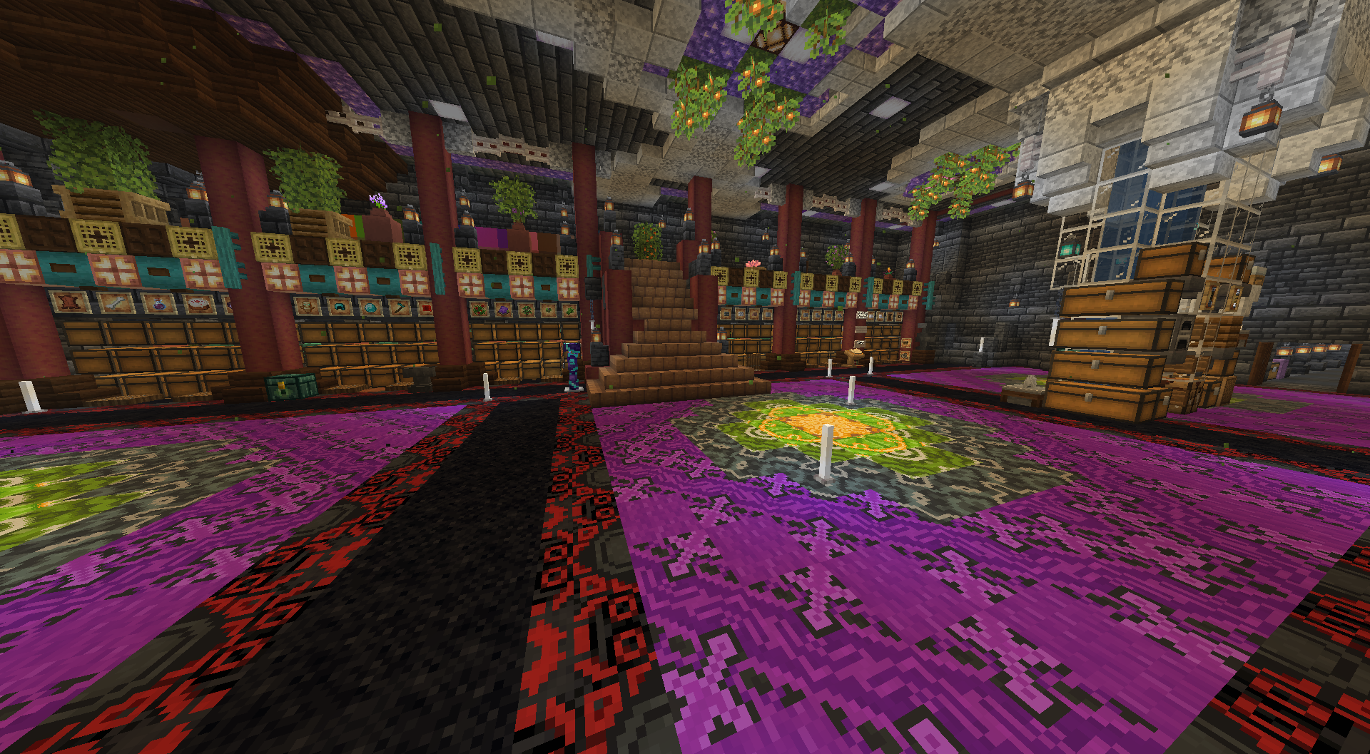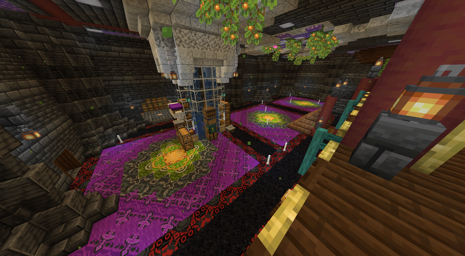 >>558355175tysome angle from the other side.One thing I hadn't noticed and that was not intentional when I designed my room is that the colors of the floor patterns mirrors other color in the room, I always just looked at my room and looked at colors and felt something was off or right, just by fuzzy taste judgmentthe purple mirrors the amethyst of the ceilingthe red mirrors the mangrove pillarsthe yellow mirrors the lights, the glowberries, the few bamboo trapdoorsthe green mirrors the hanging glowberry leavesI think what makes it looks good is that despite it being a bit cluttery is that it's mostly centerd around those 4 colors +white and black If have one advice it is this: take things slowly, don't hesitate to tear down and reassess things constantly, I probably did 5 iterations of the pillar part before I felt satisfied, and this floor was I think preceded by 3 previous attempts at good floors