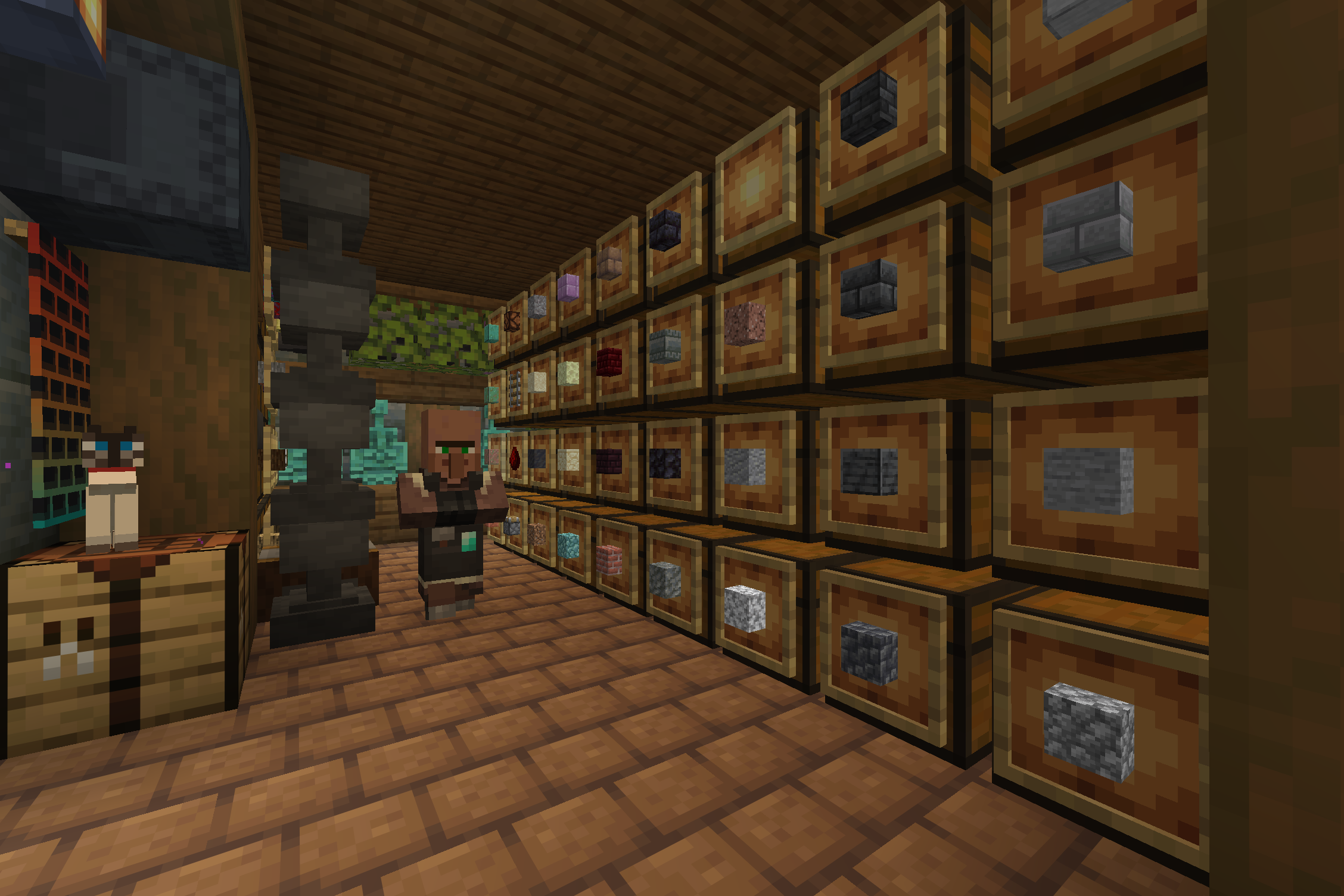 >>558392439It kind of is a storage village. It's not all connected into a single automatic sorting system, though. I've designed my whole "base" to be like a small city, where I have different buildings for different things. The storage building stores mostly construction materials and some other junk, but I have separate buildings for other things like rockets, food, etc.Pic related is my other storage building that I use for dyes, wools, banners, and leather. [1/2]