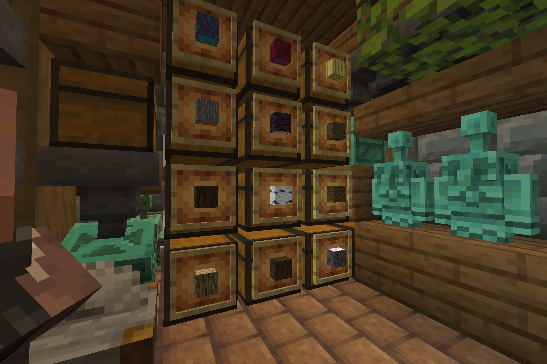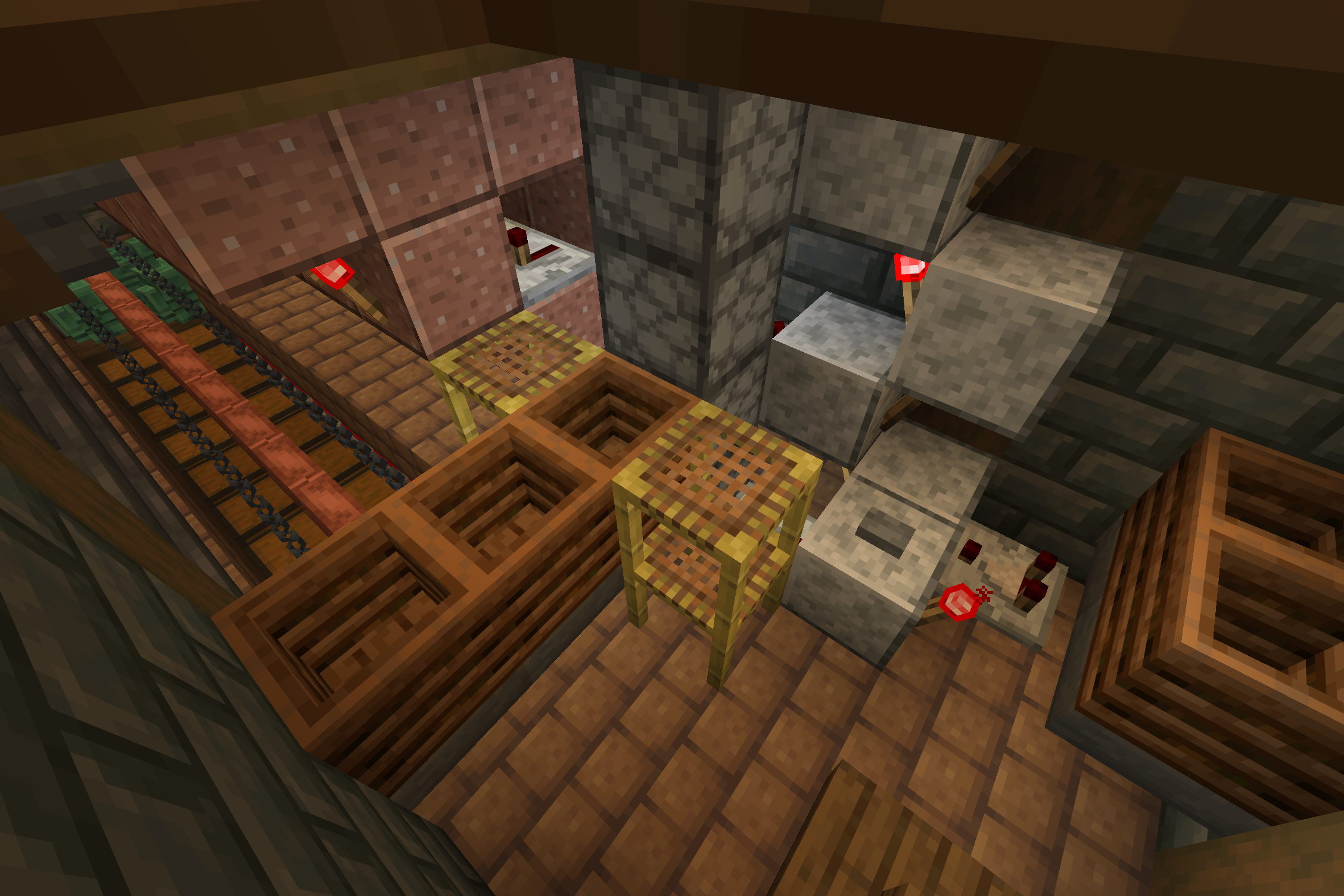 >>558392771The second sorter on the first floor uses a sorter of my own design where two golems walk back and forth on two levels behind a stack of chests. I did it this way because I wanted each type of wood to have it's own chest. Also because this is what I could fit into this space (I built this building before the copper age, and then re-built the interior with copper golem sorters).[3/7]