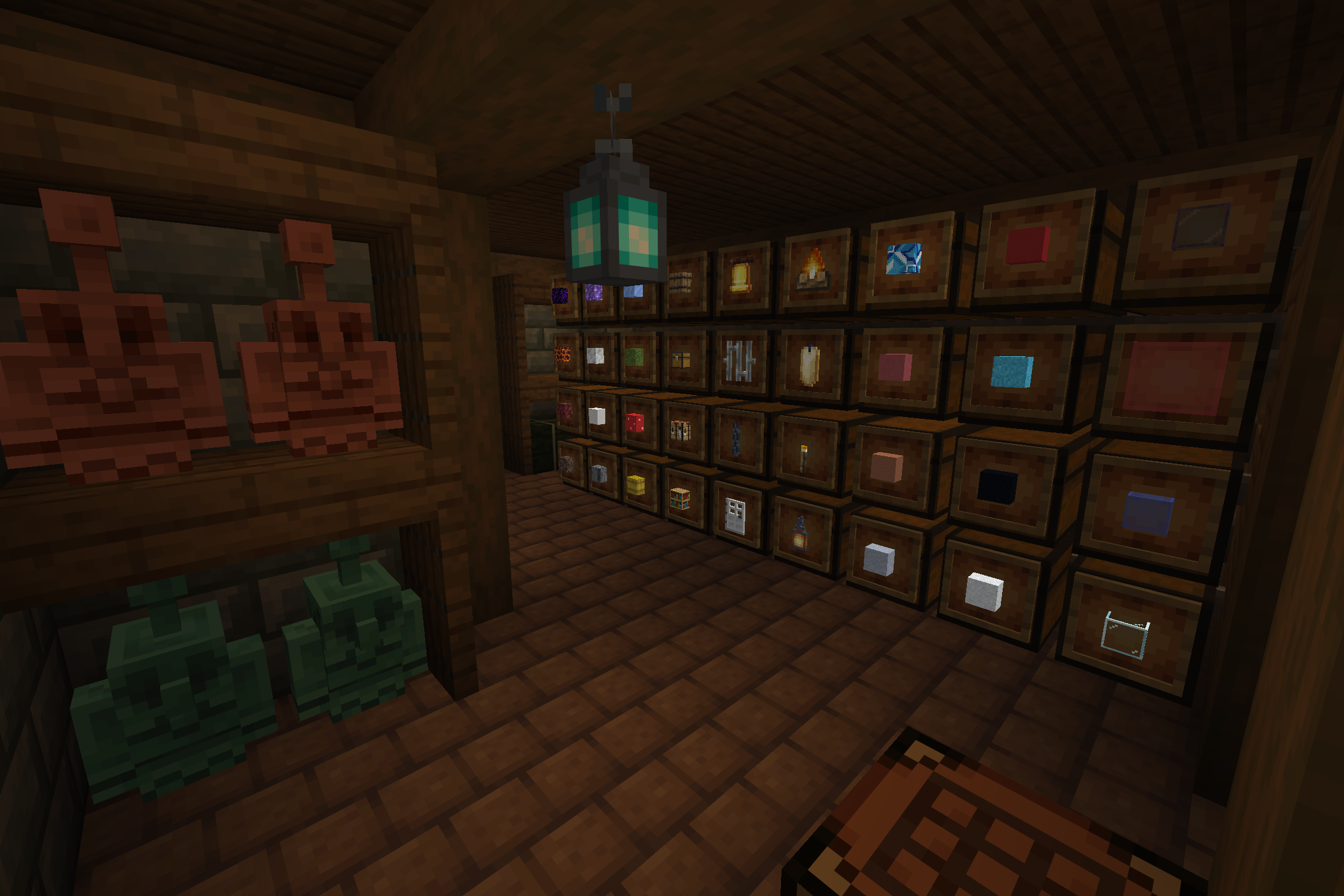 >>558349167This is my main storage building. It has a fully automatic sorting machine powered by copper golems.[1/7]