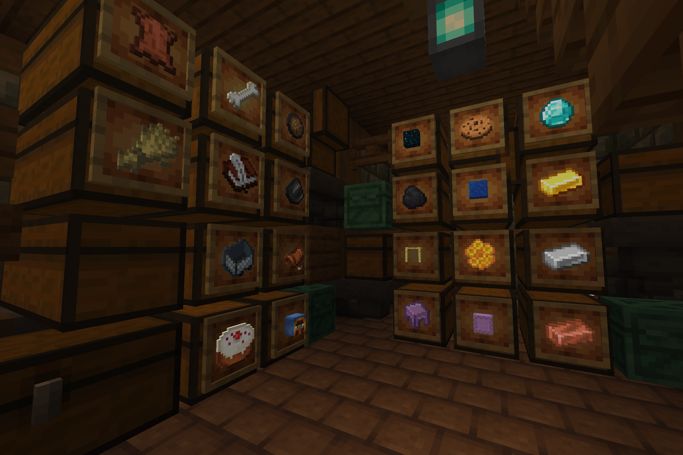 >>558349167part of my basementI basically just have a bunch of barrels in my kitchen up along the ceiling as cabinets (mostly food/plants/other mob drops)some barrels and chests in the basementand a freezer with ice blocks and barrels for meats