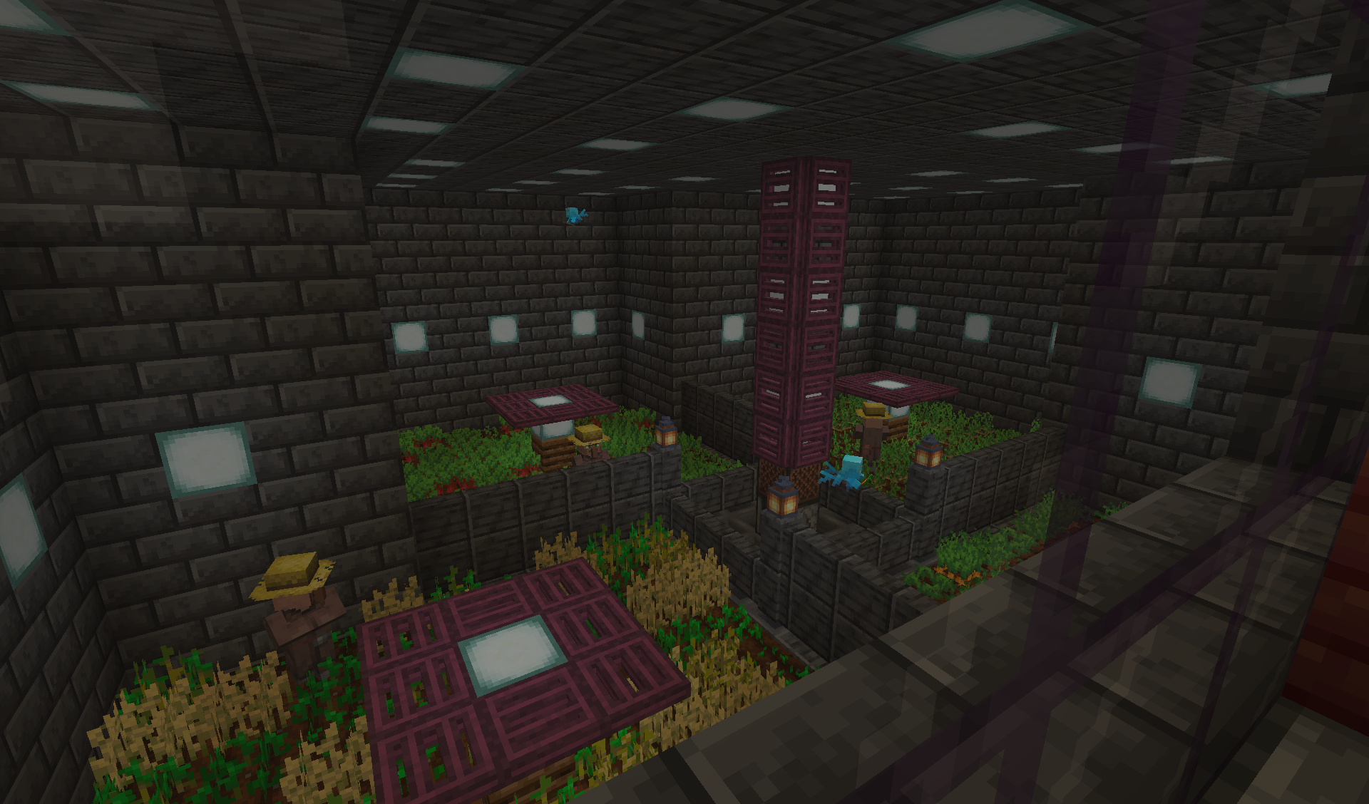 >>558570035Nope, it's fully automated. To be honest I looked up the general concept in a tutorial on Youtube, although the specific implementation is my own.The way it works is that villagers harvest and immediately replant crops, but their inventory is full, and they can't get to their composter workstations because they are blocked off by the trapdoors (the villagers are too tall to fit under them). So the surplus harvest can't be picked up by the villagers and just stays on the ground until allays collect it. There are four sections, four crops, four villagers, four allays, but all feed into the same sorting system. Since recently wheat is filtered out down the hopper line and crafted into hay blocks for storage efficiency.