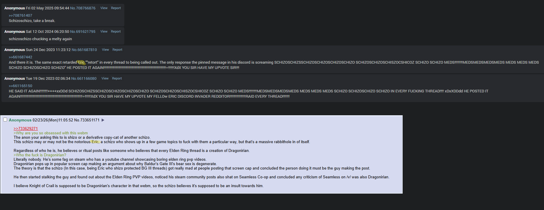 >>558371029Can you retards take back your fucking schizo from the /v/ threads? He already outed himself as the fag who makes up bullshit headcanon about the Sun Realm and now he's having a tantrum and spouting off random names.