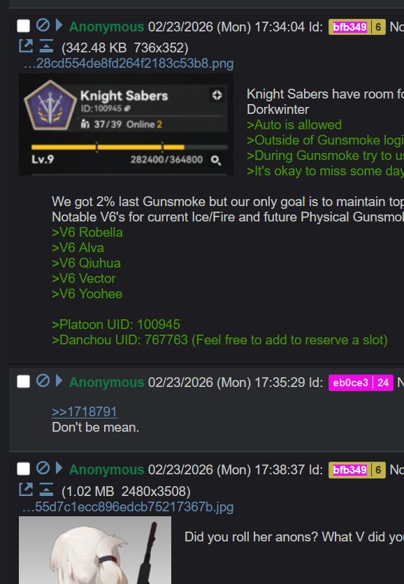 Knight Sabers have room for new members on Dorkwinter>Auto is allowed>Outside of Gunsmoke login once every 7 days>During Gunsmoke try to use 2 tickets a day>It's okay to miss some days if you can'tWe got 2% last Gunsmoke but our only goal is to maintain top 5%. We're a casual platoon.Notable V6's for current Ice/Fire and future Physical Gunsmoke:>V6 Robella>V6 Alva>V6 Qiuhua>V6 Vector>V6 Yoohee>Platoon UID: 100945>Danchou UID: 767763 (Feel free to add to reserve a slot)