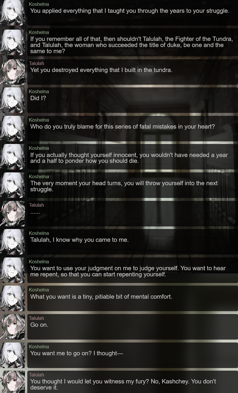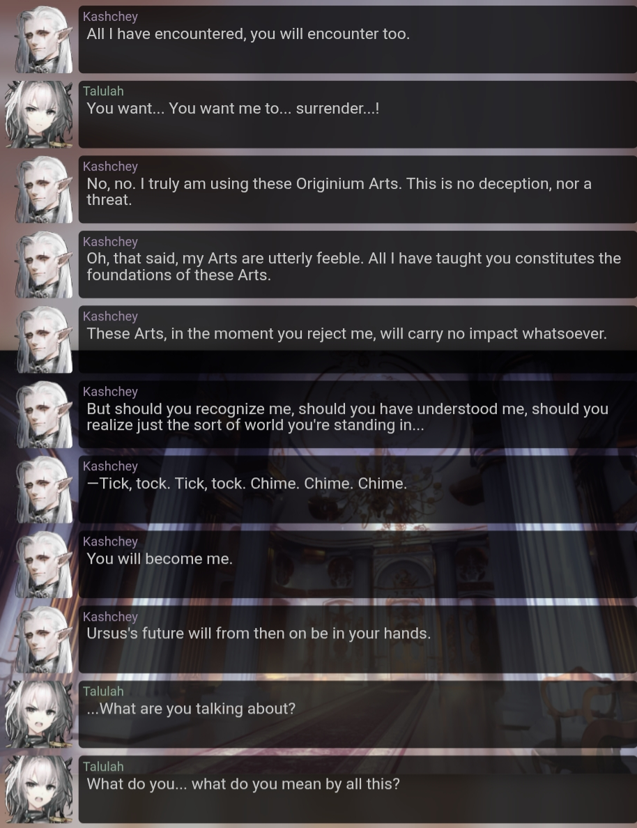 >>558392701The Phidia Duke Kaschey was just another in the line of hosts for DBS. When he raised and taught Talulah his ideas were planted in her head, and even when she didn't agree with them they stayed.When everything with Reunion went to shit and Talulah was at her lowest she fell in line with those ideas, and the conditions to be a host for DBS were fulfilled. From there you can surrender yourself to a sort of control but in the end of everything, everything the host does is explicitly by choice because they agree with it. DBS couldn't make Talulah destroy the abort key for Chernobog for example, which was her last ray of hope.Ch7/8 were full of themes about how we pass on ideals and influence others with them, and this was the main way they showed it. DBS is like how people can lose themselves to an ideology and almost stop being their own person.