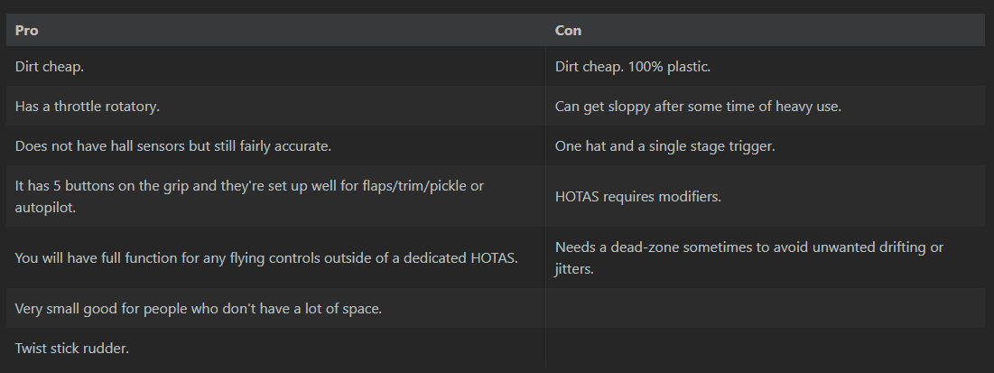 >>559742037It was my daily driver for a few years, throttle could do with the occasional Vaseline/nyogel on the rails but it's serviceable and nice amount of buttons for the priceIf you have a webcam, you can use opentrack for head tracking which frees up the hat on the stick for your trim