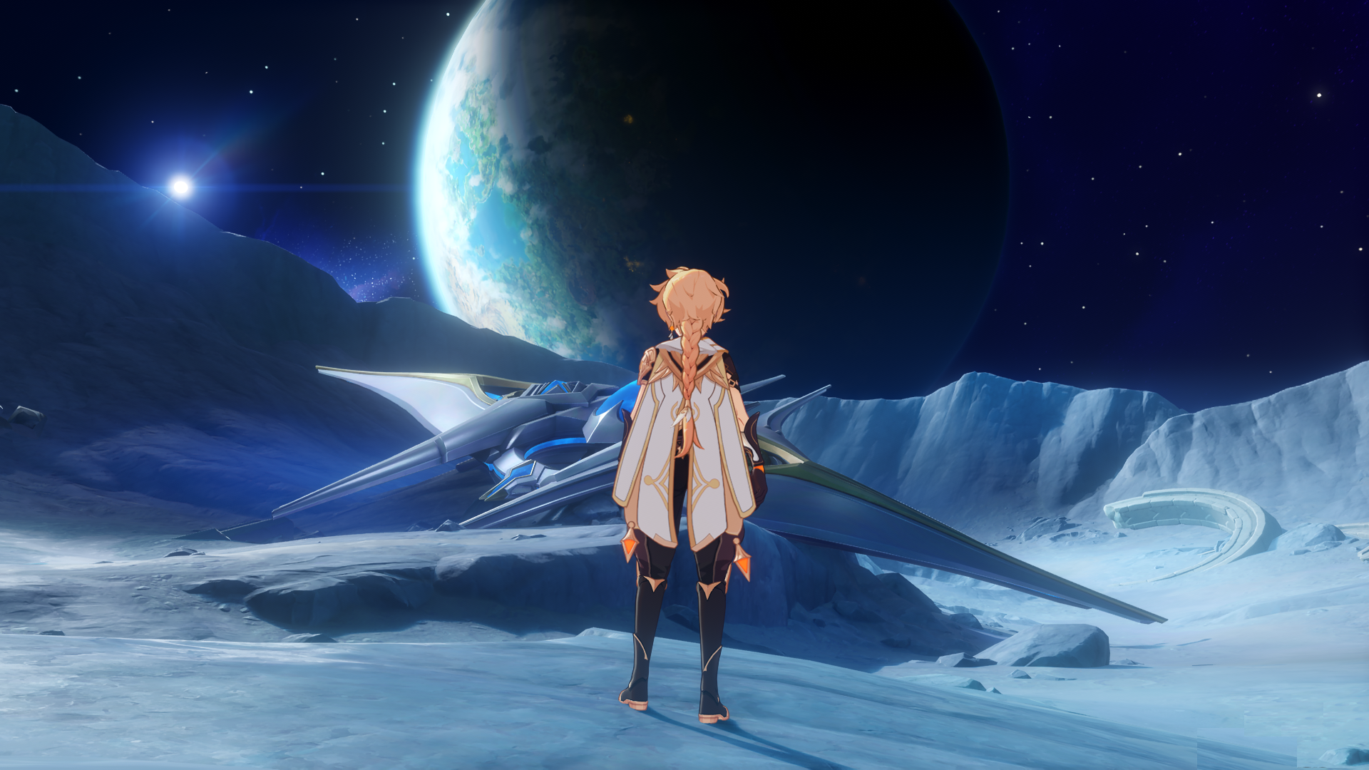 Any explanation why the spaceship we saw crashed onto Nod Krai, and it was revealed as such through Columbina and through projections of the Hyperborelean past, but then in the end we actually crashed/hid the ship on the real moon?At least we can conclude that the Travellers entered the scene after the bout between Heavenly Principles and Nibelung.