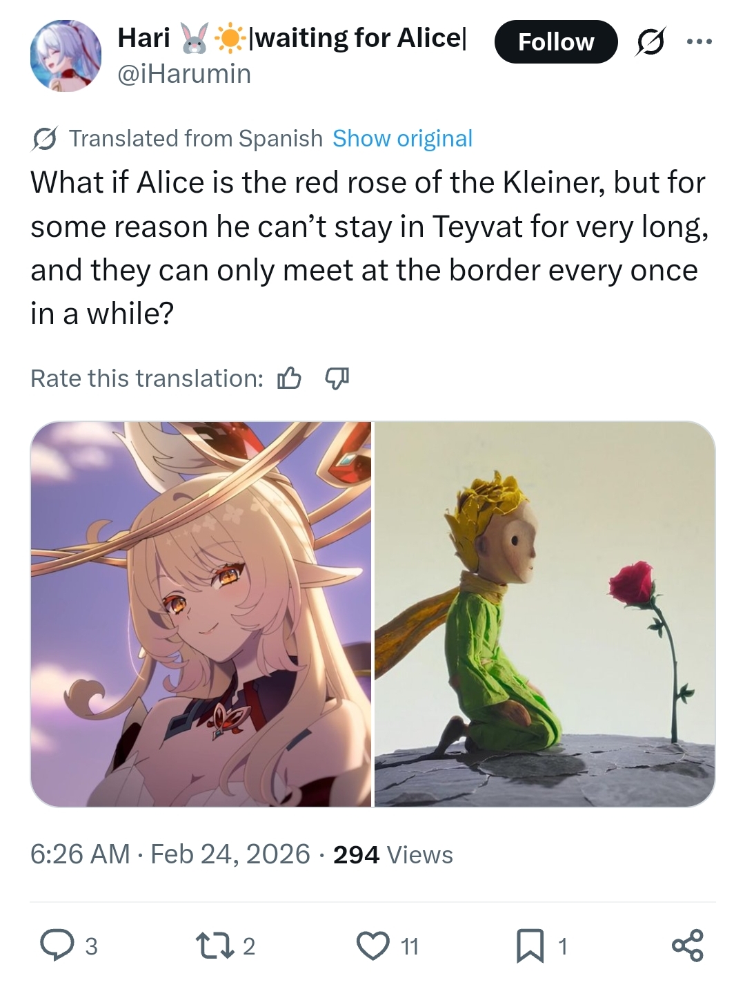 New resonance: When the player owns both Alice and Kleiner, they will receive a Klee every 9 months.