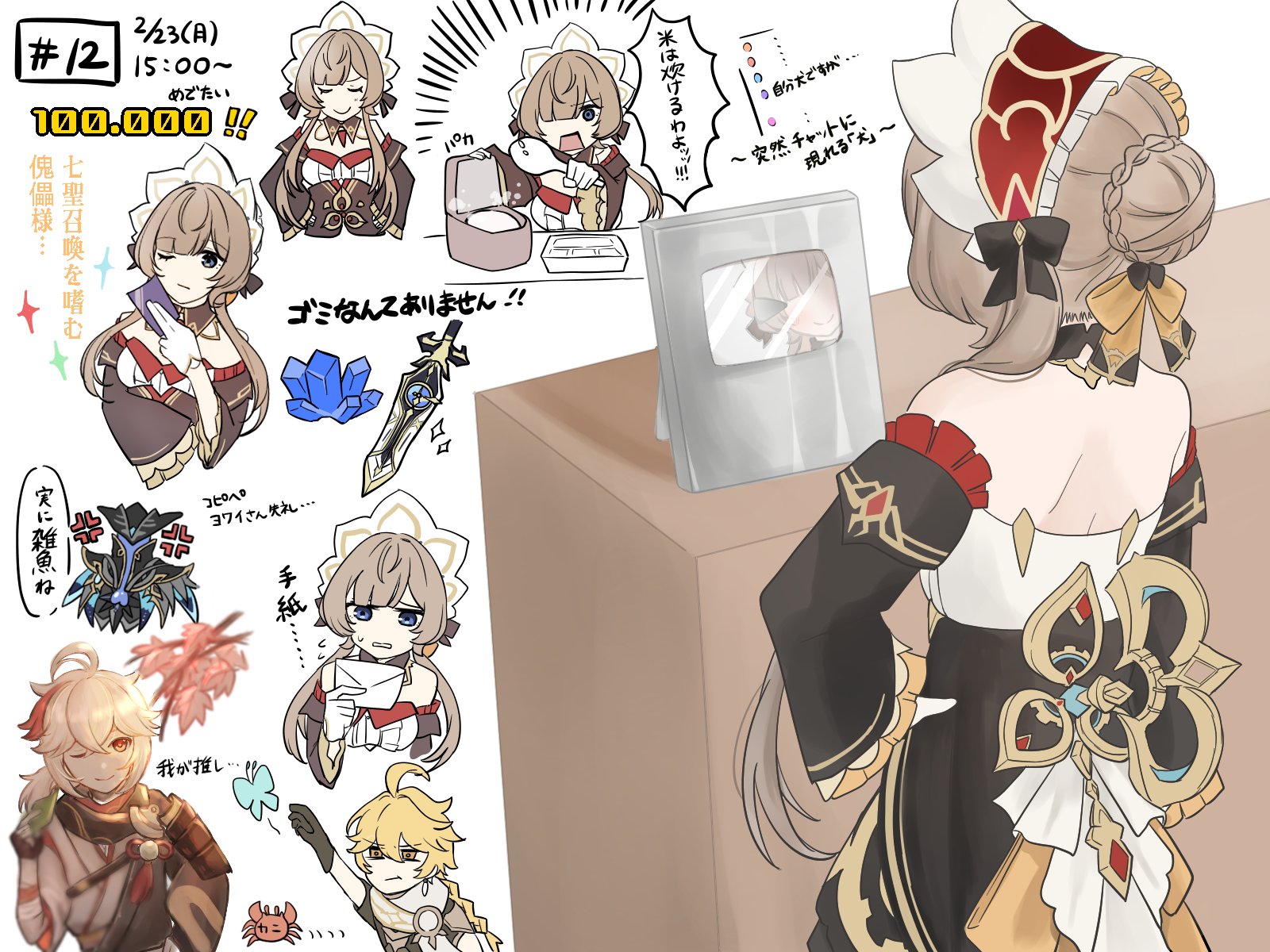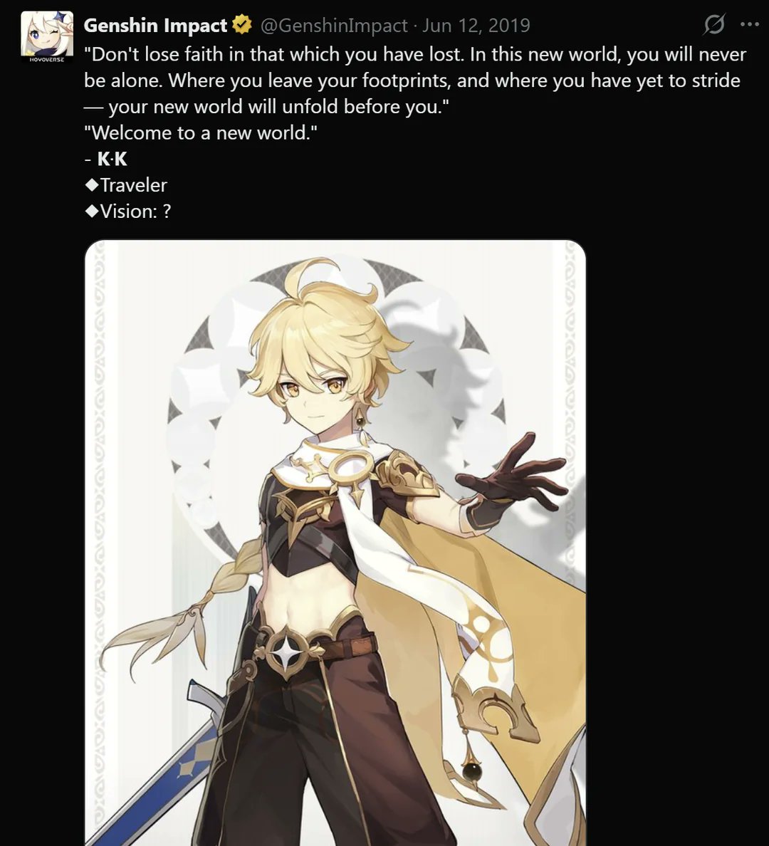 Previous:>>558370342>Character Teaser — "Varka: Where the Knight's Heart Leads"https://youtu.be/fpNygi8Vd0A (EN)https://youtu.be/GAqgp1JMjKo (JP)>"Another Prologue" Animated Shorthttps://youtu.be/4s7G9I4SGZc (EN)https://youtu.be/waZgLGxJN6E (JP)>Version "Luna V" "Homeward, He Who Caught the Wind" Trailerhttps://youtu.be/p02WXZZ84M4 (EN)https://youtu.be/V30u55XoYrE (JP)>Character Trailer - "Zibai: Mortal Flesh to Kindred Earth"https://youtu.be/6iE9Gwiuz3E (EN)https://youtu.be/t4xEbesXXtg (JP)>Character Trailer - "Illuga: Shimmering Plumes of the Dawn Oriole"https://youtu.be/qoF5VjO0_iE (EN)https://youtu.be/sCPfCRuInAc (JP)>Character Teaser - "Zibai: As Drifting Wayside Dust"https://youtu.be/uFKQL6xPbRU (EN)https://youtu.be/1Y3Q1xNktU8 (JP)>Current character banner: Zibai, Neuvillette, Illuga, Aino, Gorou>Current weapon banner: Lightbearing Moonshard (Sword), Tome of the Eternal Flow (Catalyst)https://www.hoyolab.com/article/43195205>Daily check-in rewards (permanent)https://webstatic-sea.mihoyo.com/ys/event/signin-sea/index.html?act_id=e202102251931481&lang=en-us>Redeemable Codes with Primogems (all regions): https://genshin.mihoyo.com/en/giftGENSHINGIFT8X73KH58KDHNJTSHBHPPKUSV (NEW)>Useful Links (Wiki, Simulators, Maps, Character Builds, /gig/ friendlist, Third-Party Tools, etc.)https://rentry.org/giglinks/gig/ OP pastebin (use this if making new thread):https://pastebin.com/ca0zseQ9