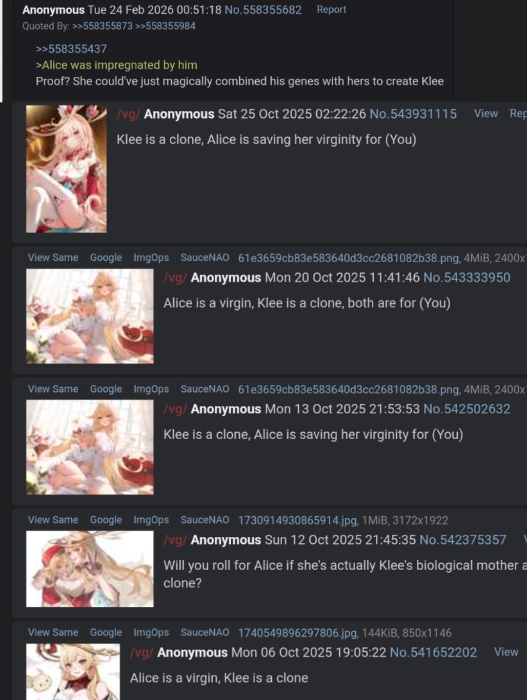>>558401481I am not the one who's delusional enough to think that Alice is a virgin and will be for (You) though.