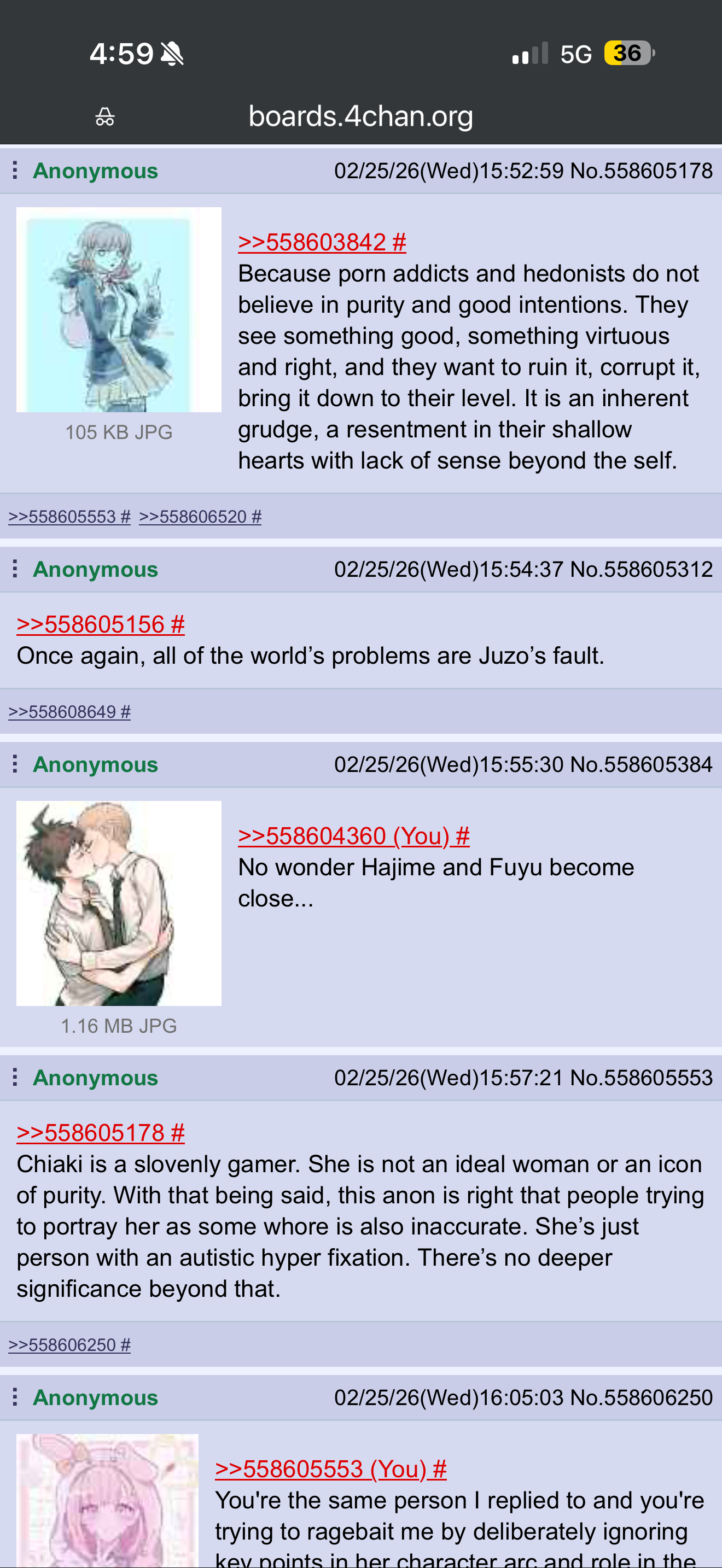 >>558615303I said I'm addicted, not that I like doing it. >>558615357But you are deliberately omitting the part where you said that this has no deeper meaning. Now, this could mean that you disagree with my description of porn addicts, or that you simply do not see Chiaki fitting the description I gave. Now you've admitted it was the latter, but even so, you're not trying to contradict my explanation of why I think Chiaki fits the description of a virtuous character, you're just saying “you're looking to deep into it” and admitting that you didn't give it much thought.Now, if you yourself admit you didn't give much thought into it THEN WHAT THE FUCK MADE YOU THINK YOU CAN COME HERE AND WASTE MY FUCKING TIME WITHOUT EVEN GIVING ME A PROPER DISCUSSION HUH!?! YOU PIECE OF SHIT! I WILL BREAK YOUR LEGS AND BURN YOU ALIVE. Nevertheless, I am glad that we were able to reach an civil agreement on this matter. Cheers!>>558615573>usTalk for yourself, buddy boy.