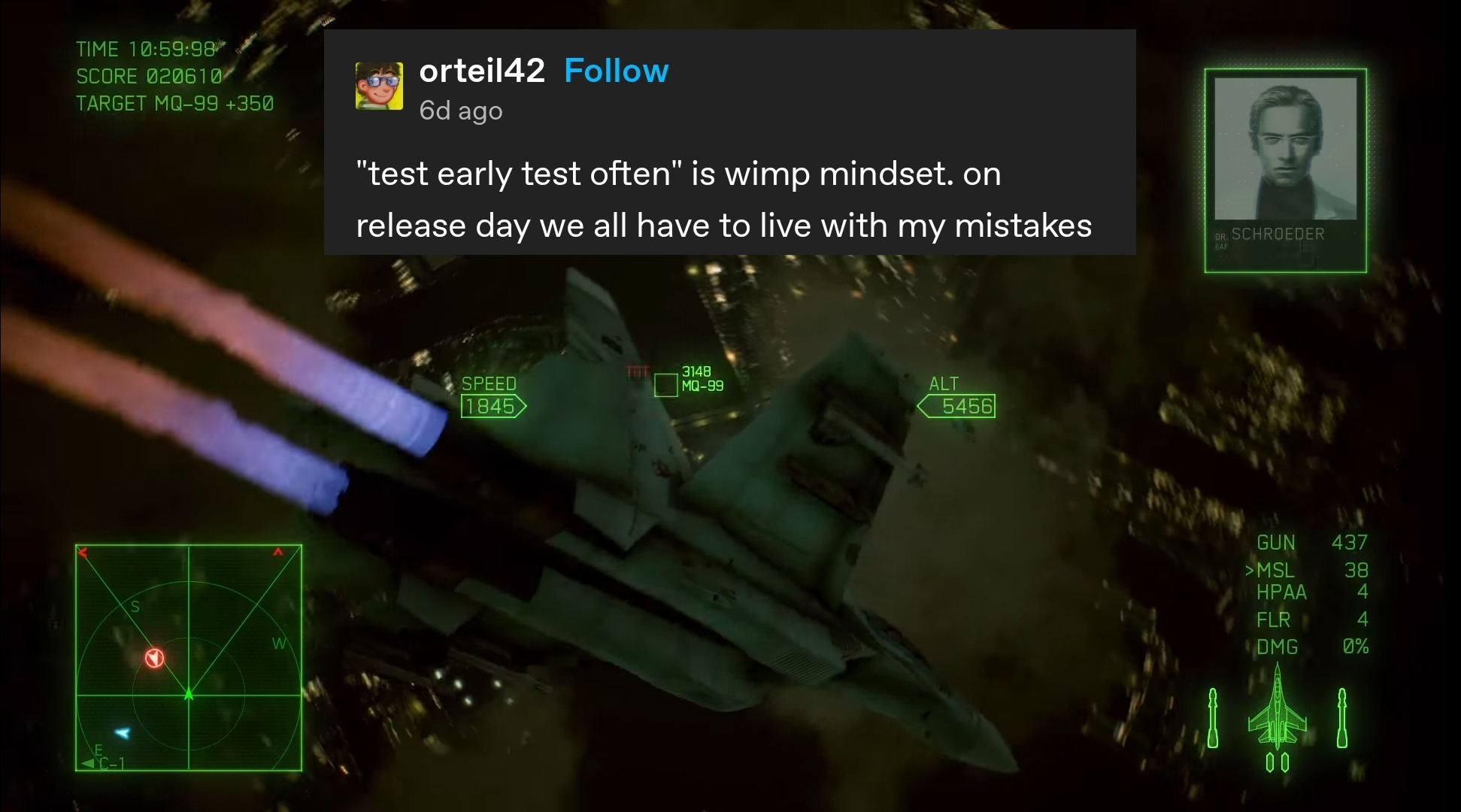 >>558424454Trigger's obvious with the Eagle, but I like to think he flies a Hornet during mission 3 and 4 so the Harling things makes a little more sense to me. During his time in Spare, I like to think he gets whatever they have ready to fly and gets an A-10 for Long Day and Pipeline Destruction. When I replayed recently, I did a couple missions where Wardog flew F-20s and X-29s depending on mission so that's what I imagine before they get their F-14s. Zero I just imagine Cipher going straight from his Draken to an Eagle about halfway through the game. Plane Jesus flying a Euorfighter makes a lot of sense honestly since some Mobius pilots in the final mission have them. I'll have to try that when I replay 4. X I'm thinking Gryphus One uses the Apalis before getting his Raptor, because it's pretty middle of the road as far as the superplanes go.I don't have any thoughts for the rest of AC, but for Project Wingman I think of Monarch going Phantom/Tomcat/two seater Chimera, with the Frogfoot used for A2G missions.