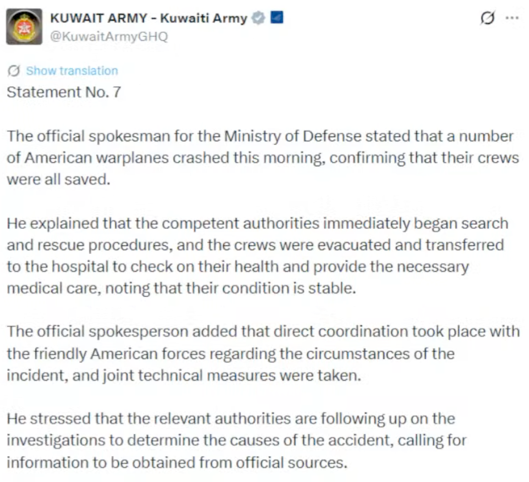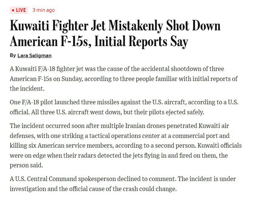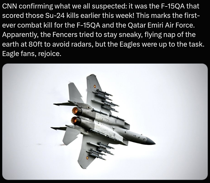 Legacy Hornet enjoyers, you'll be pleased(?) to hear that apparently those Strike Eagles downed in Kuwait were hit by an F/A-18C with 3 Sidewinders. https://www.twz.com/news-features/kuwaiti-f-a-18-hornet-responsible-for-shooting-down-three-usaf-f-15e-strike-eagles-reportWell it's not confirmed because it's being sourced from one contacy from one story from the WSJ, but I choose to believe it because it's very funny that some random Kuwaiti pilot almost became a reverse ace in a day