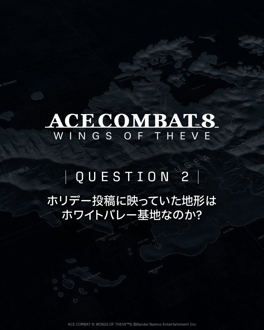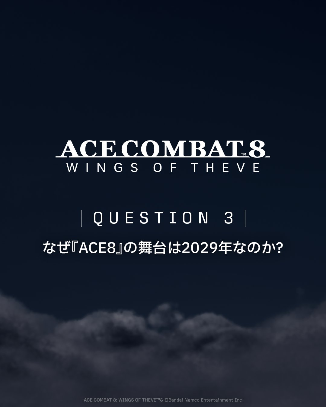 Why is ACE8 set in 2029?The Ace Combat series' strange realityhas always been setin a time slightly ahead of the real world.By depicting technology extending from reality,it creates a realistic fantasy world. Set 10 years after ACE7, which took place in 2019,the story of ACE8 unfolds on the Eurasia continent in 2029.Beyond that, the series' timeline connectsto the world of ACE3.