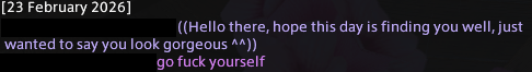 blogopost of the day>hanging out with one friend in his house>chilling, our moonies are cuddling, hes tabbed out, i go afk for a couple of minutes>i come back and a mutual friend is cuddled up next to us>say hello?, he says hi, first friend still afk>i dont like what i see so i teleport to town and check sales instead>friend 2 runs up to me a few minutes later and is upset that i would just leave>explain that it killed the vibe, he should have asked if it was fine to come by first and i would have probably said sure, it was pretty rude and invasive, but its whatever now>he goes on a whole rant about how he shouldnt have to ask for "permission to hang out with frens", is angry that he isn't "trusted", complains about "standing his ground because he did nothing wrong", and pretty much ignores anything i try to say, give him an hour to at least acknowledge anything but no, and then i quietly log out>first friend is just a bit confused and doesnt care more than "yeah he should have asked first" and "im not close with him"