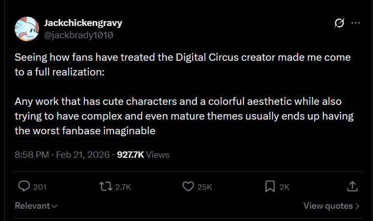 >>558466075It's just a numbers game. Shitheads feed off of and embolden one another, so large fandoms are disproportional awful since the bad actors are significantly more vocal despite making up approximetly the same percentage of people as smaller fandoms.