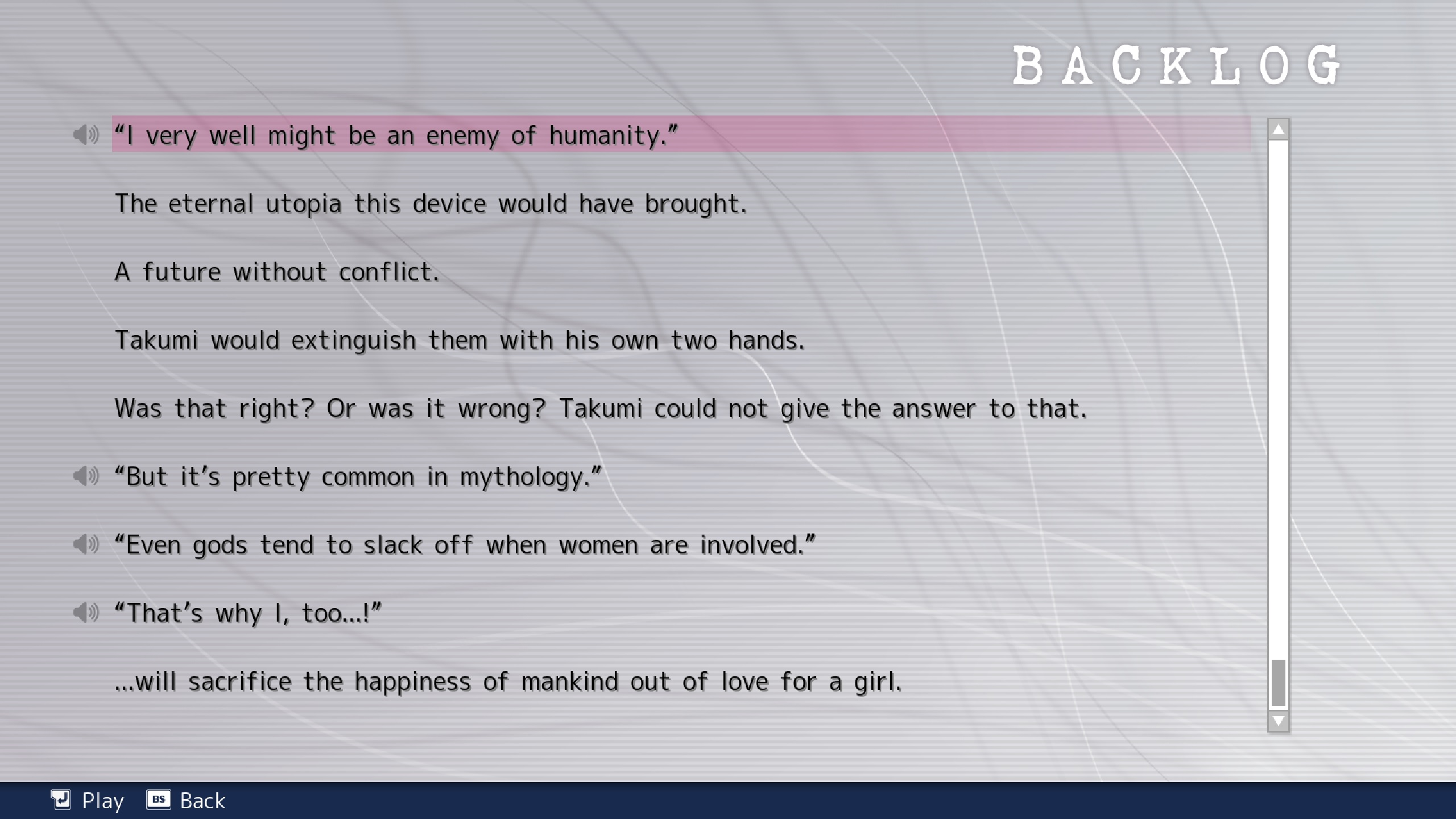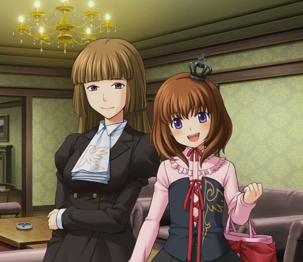 This flashback is so, so bad. It's exposition dump after exposition dump filling in backstory and worldbuilding and the VN is almost over. Here's an idea, maybe you should do literally anything with your main heroine BEFORE the true route is almost over so you don't have to dump her entire backstory and motivation in a series of exposition dumps as the VN is basically ending? It feels like a rough draft, like they were writing the VN and had all these ideas they crammed in right at the finish line and didn't go back to space them out more evenly and fill the rest of the game with them.