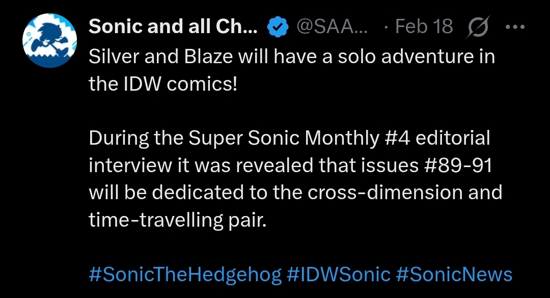 even if Silver and Blaze were "fully explored" it doesn't actually generate a cohesive star-crossed lovers mythlike there's just nothing there"sorry Blaze I can't go with you I have to go gank Mimic with my lesbian friends"and then they just end up in a mall together because Blaze is "on vacation" and only gets sent home by the Chaos/ Sol emerald interactions, and we still don't know how Silver's mysterious portals workIt's completely scuffed from a lore persepctive. It will literally never work until Sonic Team explicitly gives it a foundation