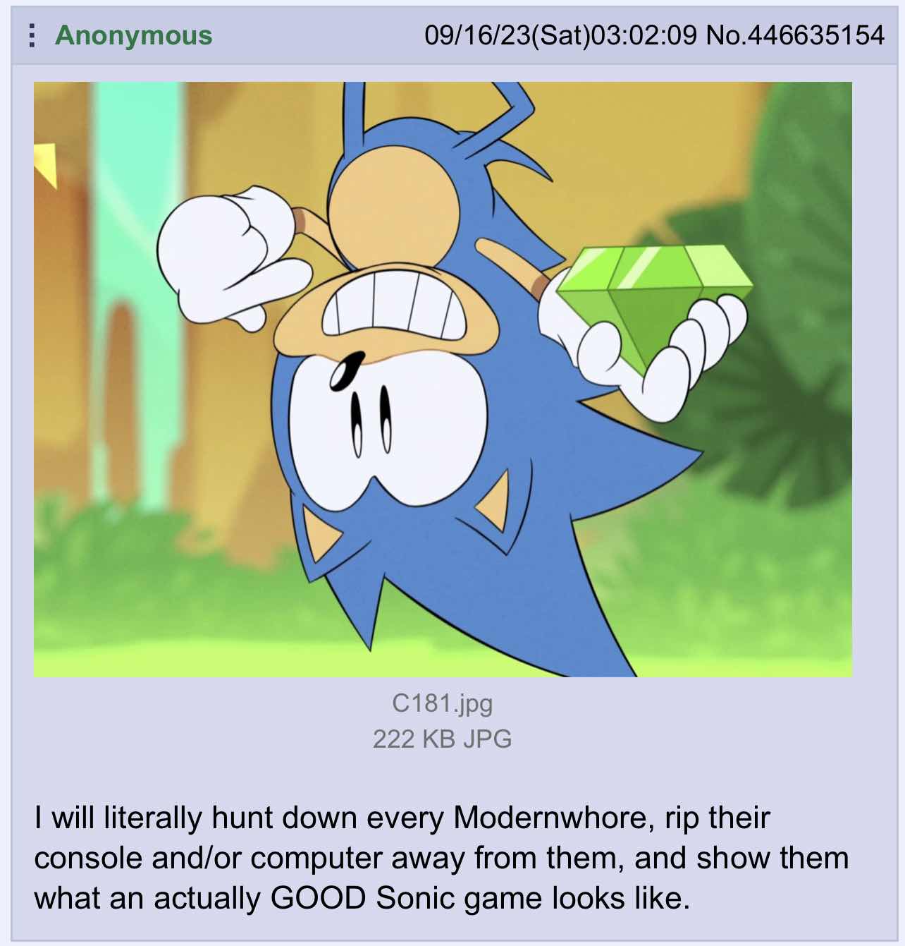 >sonic 4 is released in 2027>first thing people see is a close-up on sonic's face, a shitty slow motion with a pink filter and sonic looking and acting retardedImagine the global sperg out if the hollywood writers, boomers who hardly even know who the fuck they're writing about just go with this trope.