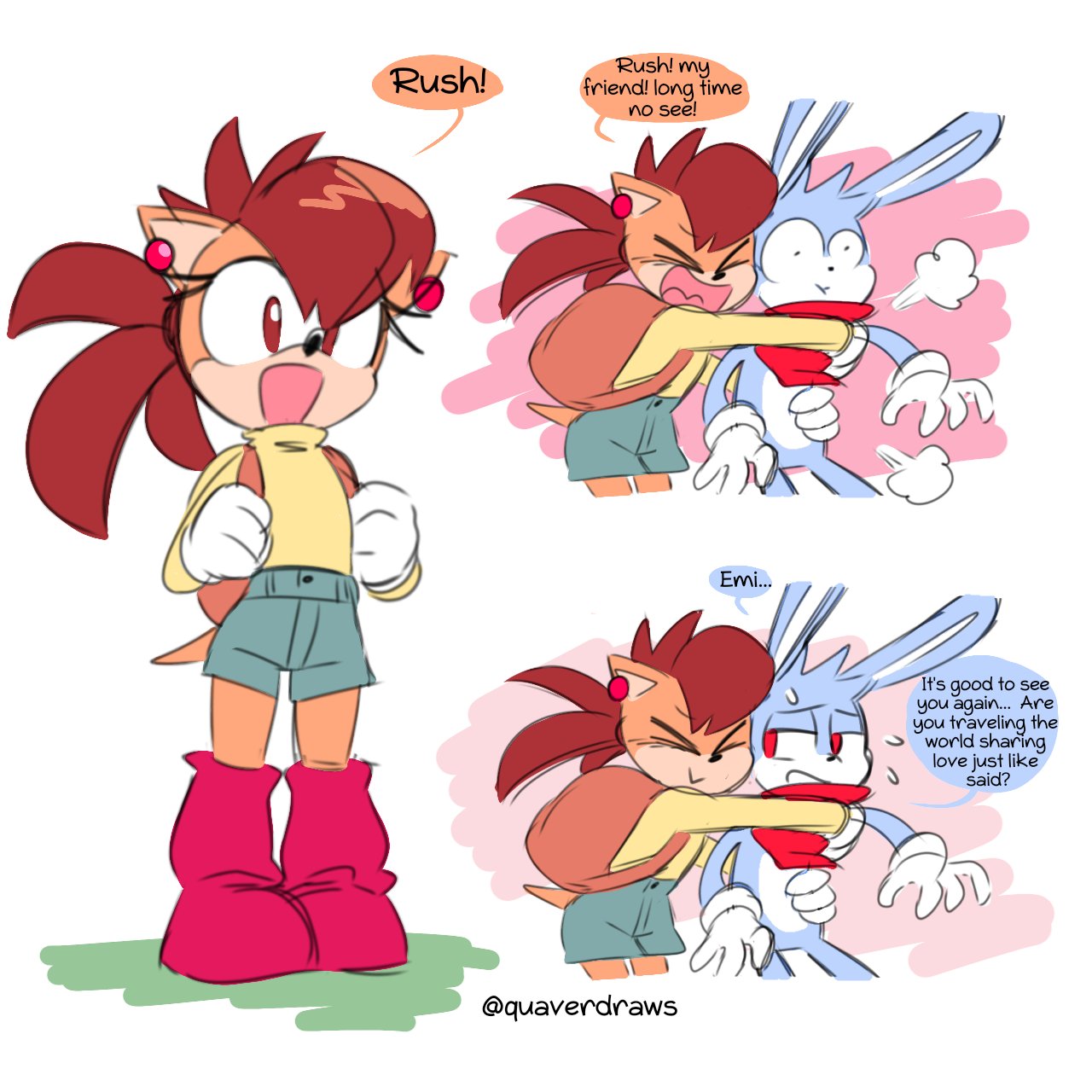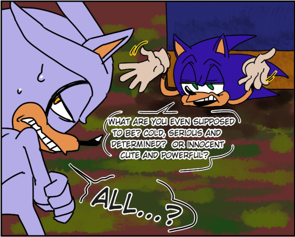 >>558463408Nega-Sonic = Tails + Amy + Knuckles, inherently.Because Tails, Amy and Knuckles all contrast Sonic in some way. Put it all together and you get the "negative" Sonic who is his perfect foil that's not simply just a sidekick, love interest or rival. But "Nega-Tails" just circles back around to Amy somehow, just from the simple fact that Tails & Amy are both opposite equivalents of what a direct ally to Sonic looks like. Either the little brother or the girlfriend, with opposite personalities. Amy contrasts Tails in the same way she contrasts Blaze, by being an energetic girly girl with passionate and intense emotions while also being Sonic-like in mindset. But those passionate intense emotions are also what separate her from Sonic's cool aloof attitude, and is shared with Blaze, because the contrast is that Blaze also has those intense emotions like Amy does but they're suppressed and bottled up because she also thinks like Tails & Knuckles combined.