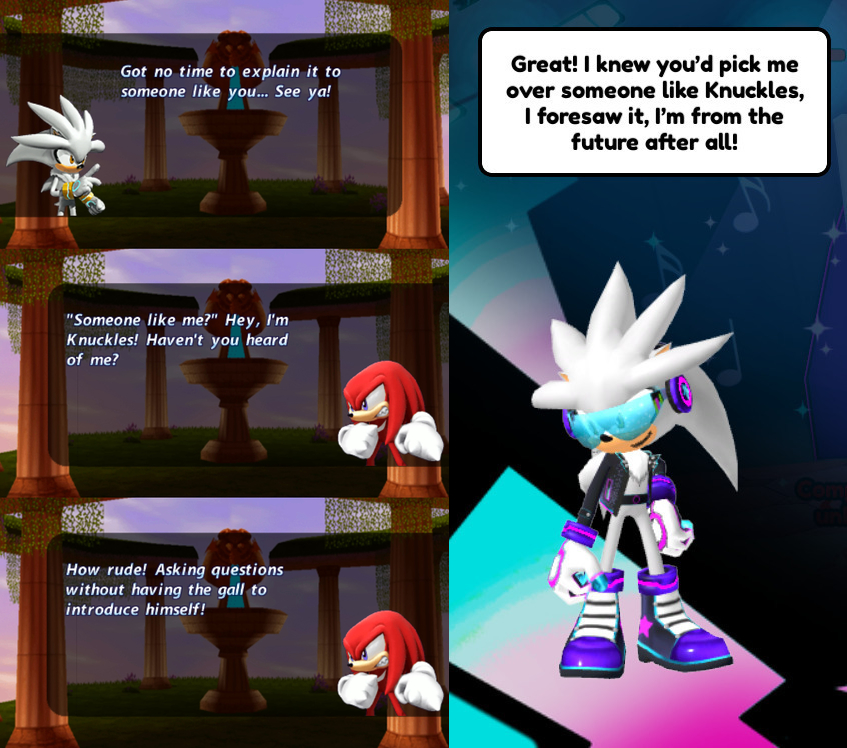 >>558466485>>558466253>>558466379>>558466104>>558466036Silver says the same thing in japanese you idiots. Knuckles is the one coming out as rude, in japanese he is much more polite.Is better in English between. Holy shit you guys are boring as fuck