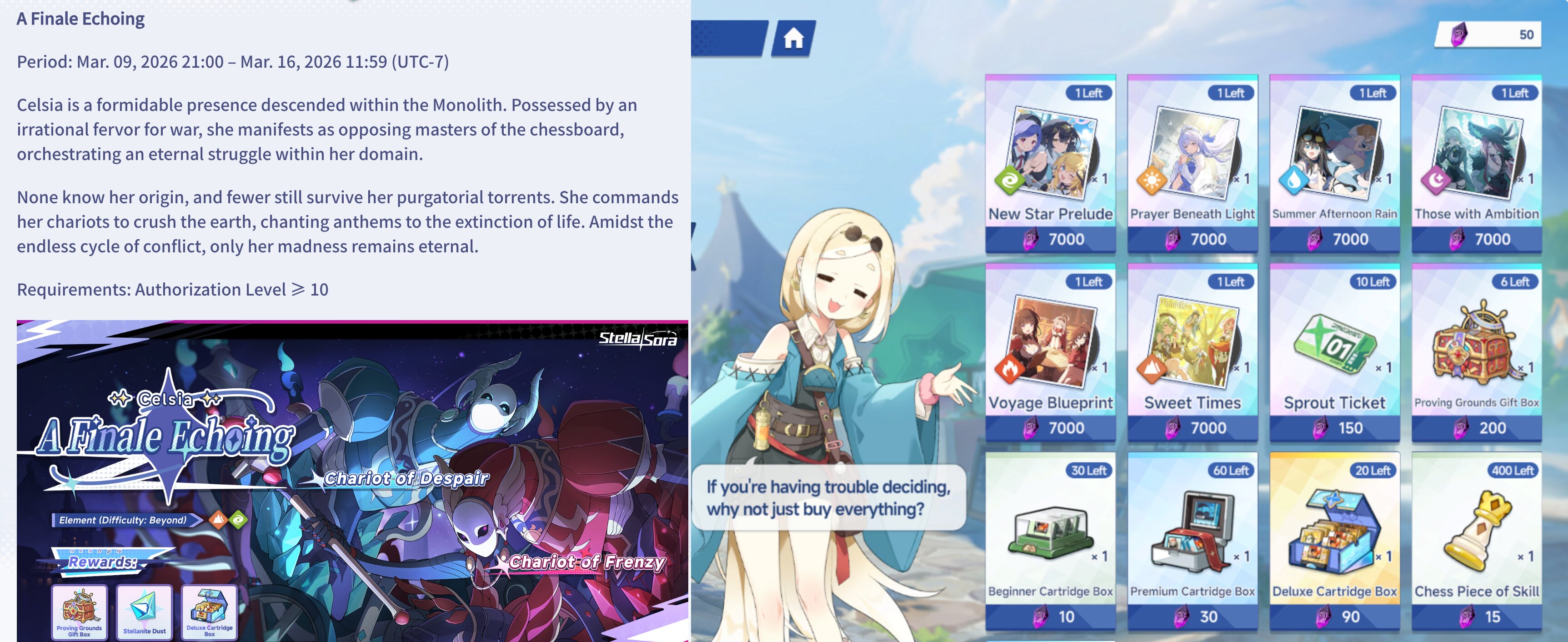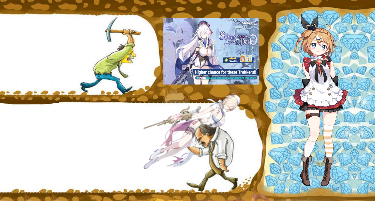 Previous Commission: >>558278949>Game Website & Downloadhttps://stellasora.global/>JP Clienthttps://stellasora.jp/>Current Content[01/31 - 02/28] Boss Blitz (Terra, Lux, Umbra, Ignis)[Feb - March] BP Skin - Amber[02/24 - 03/16] Limited Recruit - (Ventus) 5* Wraith, (Ventus) 4* Ann, (Aqua) 4* Shimiao[02/24 - 03/16] Limited Disc Pickup - (Ventus) 5* Chronicles of Spring[02/24 - 03/16] Cataclysm Survivor - Catastrophe (Element: Ventus, Terra, Umbra)[02/24 - 03/16] Shop Skin - Gerie[02/24 - 03/10] Event - Winter Requiem and the Trigger of Dawn[02/24 - 03/02] Mini Game - Arc of Abundance[02/17 - 03/09] Recruit - (Ignis) 5* Chixia[02/17 - 03/09] Disc Pickup - (Ignis) 5* Mystic Brushstrokes[02/19] Log-in Event: Gallop Into Blooming Splendor>Upcoming Content[02/28 - 03/31] Boss Blitz (Aqua, Terra, Ventus)[March - April] Battle Pass 2D Skin - Caramel[03/09 - 03/29] Recruit - (Lux) 5* Minova[03/09 - 03/29] Disc Pickup - (Lux) 5* Midnight Mayhem[03/09 - 03/16] Mini Game - Fatebound Stella Deck[03/09 - 03/16] Raid Boss - Celsia, A Fate Echoing (Element: Terra, Ventus)[03/09] The Nova Times · Chapter 11 & 12 (Donna, Gerie)>Database, Builds and Toolshttps://stella.ennead.cc/>Resources and useful linkshttps://pastebin.com/RXz7Dw7S (Friend list)https://rentry.org/StellaSoraResourceshttps://rentry.org/SoraTierListshttps://rentry.org/StellaSoraAscensionGuide