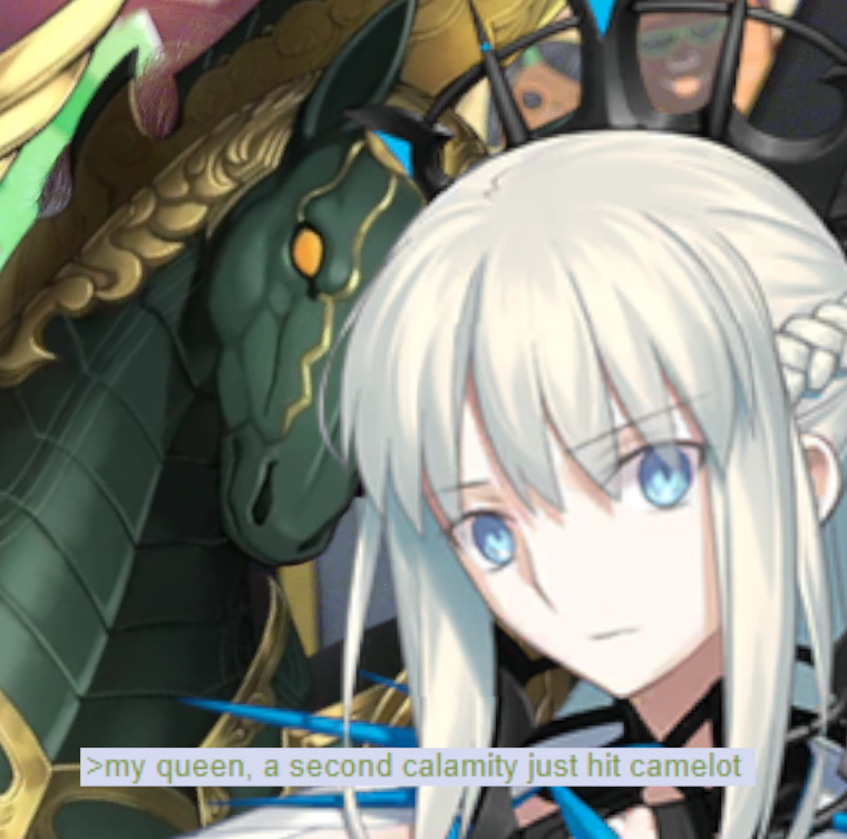 My point is that the mech needs to show up in gameplay or something instead of being off-screen/unavailable 99.99% of the time. Otherwise I could just spout bullshit like "ackshually Artemis counts as a mecha Servant because she has a mecha body that was destroyed in all timelines and we'll never get to see or use it" which is dumb.
