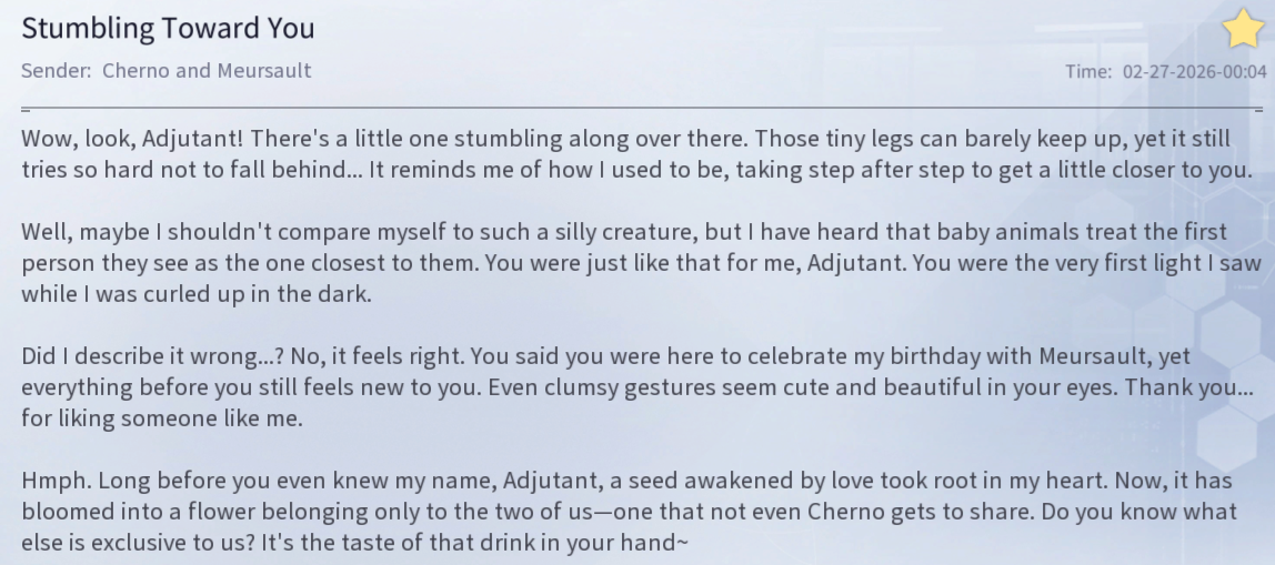 I really appreciate that I can do the tasks in this game in like 20 minutes, tops. Usually more like 10. Outside of new events starting. It respects my time. I'll be honest. I play 3 gachas right now and Snowbreak would the first I'd drop if it took as long as the other two take each day. I wish they would learn from seaslug. At least shift a lot of time-consuming daily tasks to a weekly timer so players can do it on the weekend. Gigalink and Jotun are good examples of the correct way to handle content that takes a little more time.