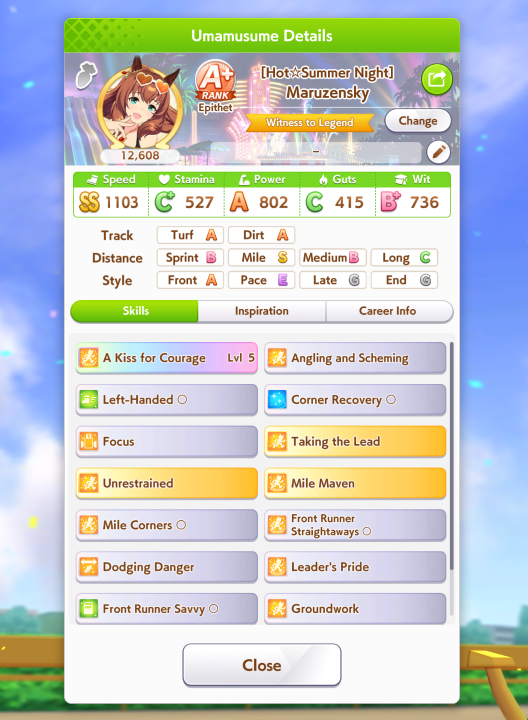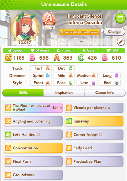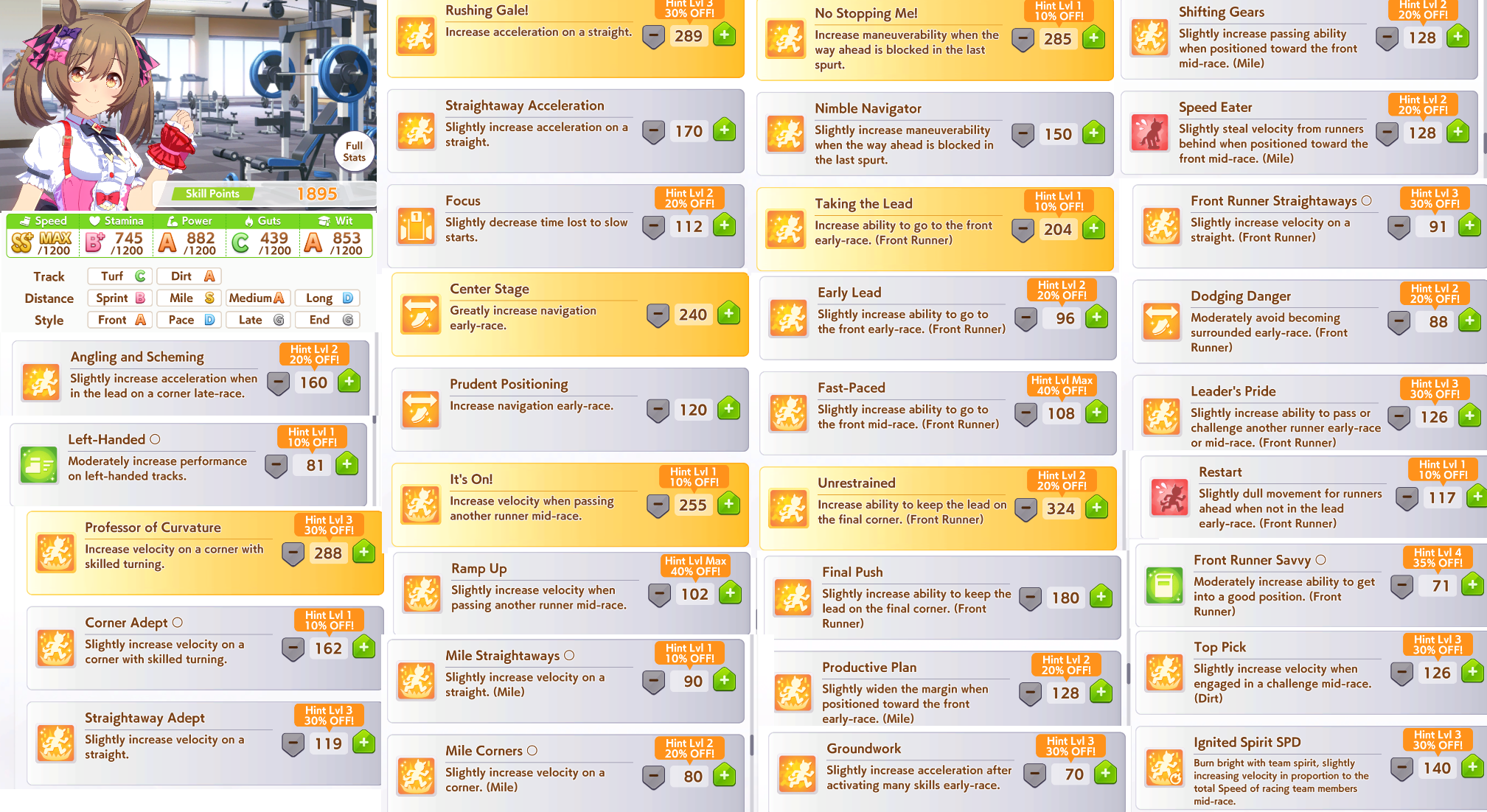 >>558487109Well at least get A&S, Left, GW, Front Savvy, TTL, and either Focus or Dodging Danger for starters.After that you want Fast Paced, Professor, Mile Corners/Straights.IDK how much SP you'll have left after that and I'm not gonna bother to calculate it. So IDK what to recommend after that. Depending on how the SP maths out, you might not want to get Its On!. However for 255 SP you probably want to get it if you can.Dont get NSM. You can get Unrestrained if you like to gamble, but personally I dont recommend it.