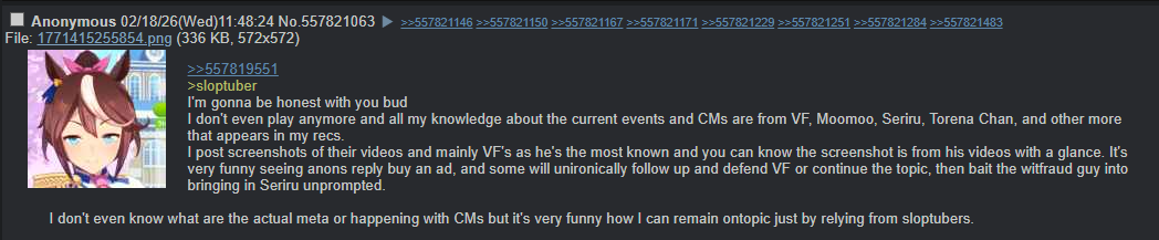 >>558487838The gaslightposting, and new anons that thought it's the norm have done so much damage to our threads. We invited the bad posters with it