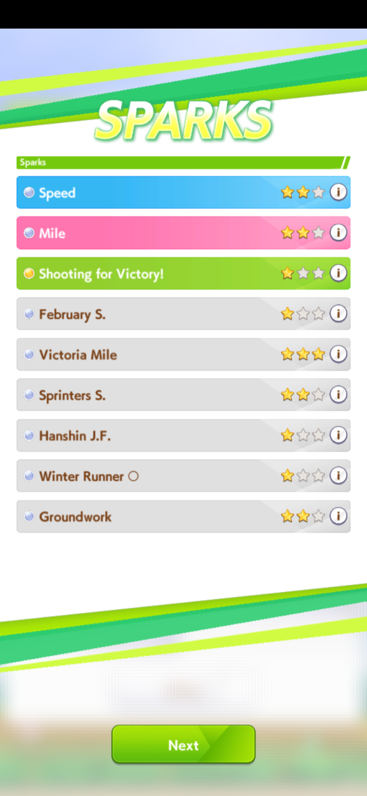 >>558487109Anglign, Left Handed, Prof Curv, Focus, Ramp Up, Mile Straight, Mile Corner x2, Taking the Lead, Fast Paced, Productive Plan, Groundwork, Front Savvy, Top PickIf any points left, Front Straight, Leaders Pride, Speed Eater, Final Push