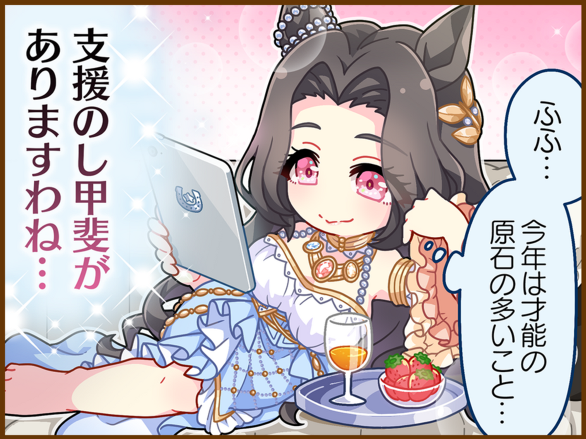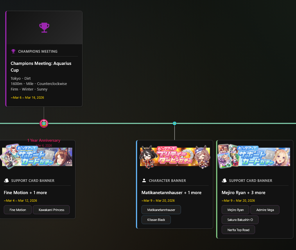 Previous: >>558420309>Global Game NewsLink your account to Cygames iDCurrent Scenario: Aoharu Hai aka "Unity Cup"Current Rate Up Trainee: Mihono Bourbon (3* alt), Eishin Flash (3* alt)Current Rate Up Support Cards: SSR Nishino Flower (Wit), SSR Sakura Bakushin O (Guts)Current CM: Aquarius Cup - Tokyo Turf 1600mMain Story Chapter 5 is out02/18 - 03/01 - Valentine Bourbon & Valentine Flash 3*+Nishino SSR+Bakushin SSR02/18 - 03/01 - The Peak of ConfectionEarly March - Aquarius Cup - Tokyo Turf 1600m Left-handed / Winter / Sunny / Firmhttps://umamusume.com/news/100040/https://pages.snep.pw/uma/anni-skill-changes/>JP Game NewsCurrent Rate Up: Almond Eye (3*), SSR Forever Young, SSR Casino DriveNew Scenario "Beyond Dreams" releasedTimeline: https://uma.moe/timelineCygames Webstore: https://webstore.cygames.com/en/umamusume_en/>Thread Clubshttps://rentry.co/umaglobalclublistYou must be E3 (20k points) to join a circle. Apply with /uma/ or /vg/ in your profile or post ID in the thread.>All Guides & Resourceshttps://rentry.org/uma26Game databasehttps://gametora.com/umamusume (Click the gear to switch between JP / global server info)A basic guide for newfagshttps://rentry.org/umaglobalFind networks if your region is blocked from the game or clienthttps://www.umavpn.top/93Seiyuu & Concertshttps://rentry.org/umstUmamusume Birthday Calendarhttps://ウマ娘.攻略.tools/events/birthdayUma Texthttps://umareader.idsmile.xyz/