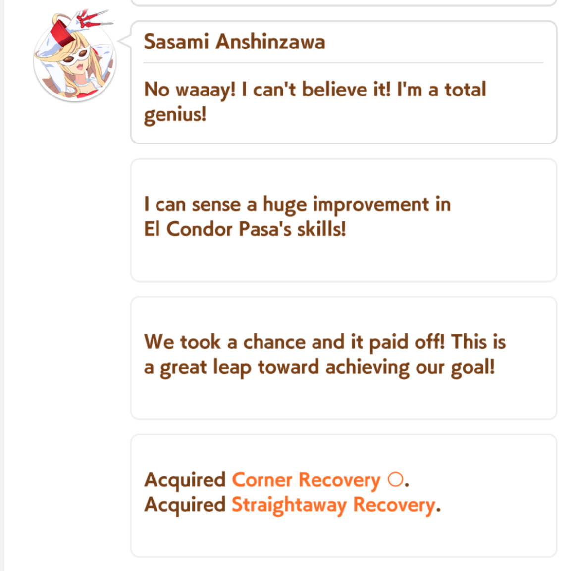 >>558488837Apparently you get a small acceleration boost whenever you change lanes, and those skills will cause you to change lanes. So if you get them together it can boost your start of race acceleration even more.