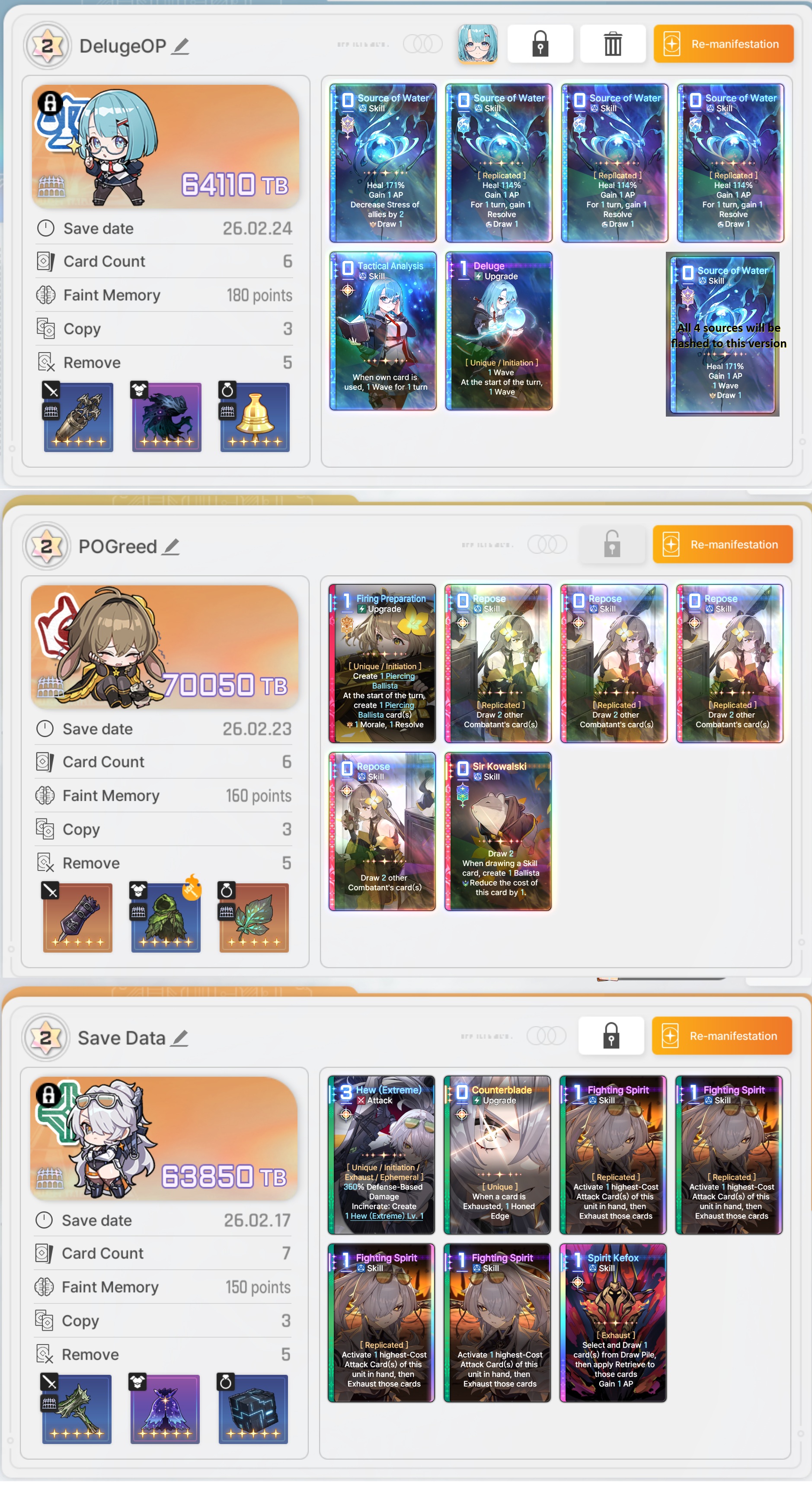 >>558473302In Chaos, she feels like a worse Khalipe. You actually have to play Nine's card. There are ways to cheat it out, but you have to actually epiphany into them, and if you're not making a Nine deck, she doesn't really do anything special. Khalipe in Chaos you don't even need to play her cards to get her to do things, and her epiphanies don't matter, she's always Khalipe. Admittedly, I don't have Nine fully built or her artifact set farmed out because I literally rolled her last night after planning on skipping her, so she might be fine for save data, but so far in the Chaos runs I've done, she feels extremely overrated. >>558473360There are some enemies in the game that punish card spam. Beryl and Nine are both good counters for it. No one has said anything about Beryl nerfs, but she's definitely next on the chopping block if they're still going that route.