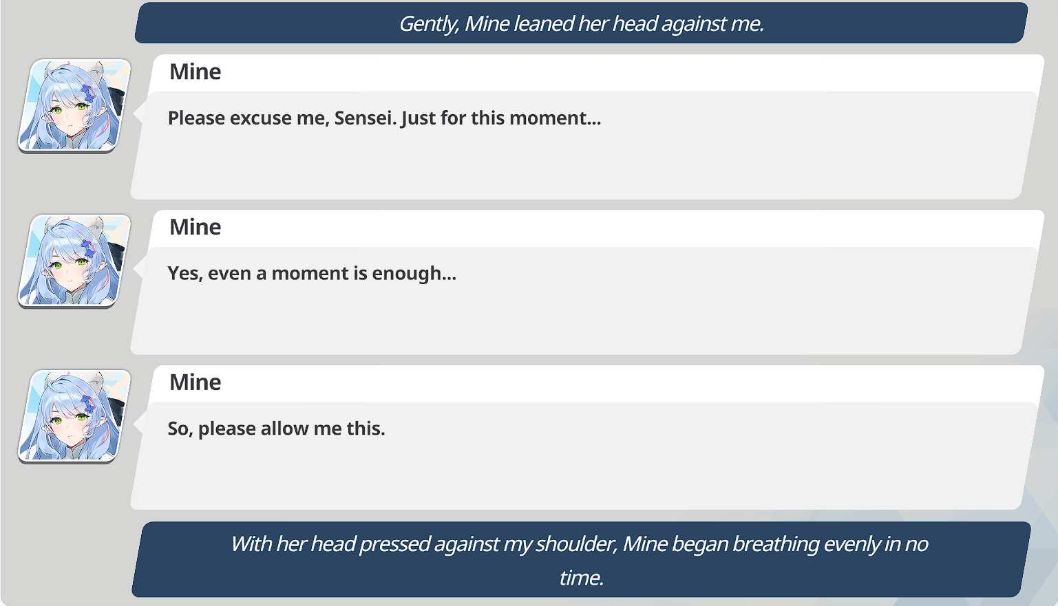 >Nagisa was the one asking Mine to assist Arius>Mine was meant to sit at the Tea Party but the club refused to sit at the table to have the freedom to pursue their goals