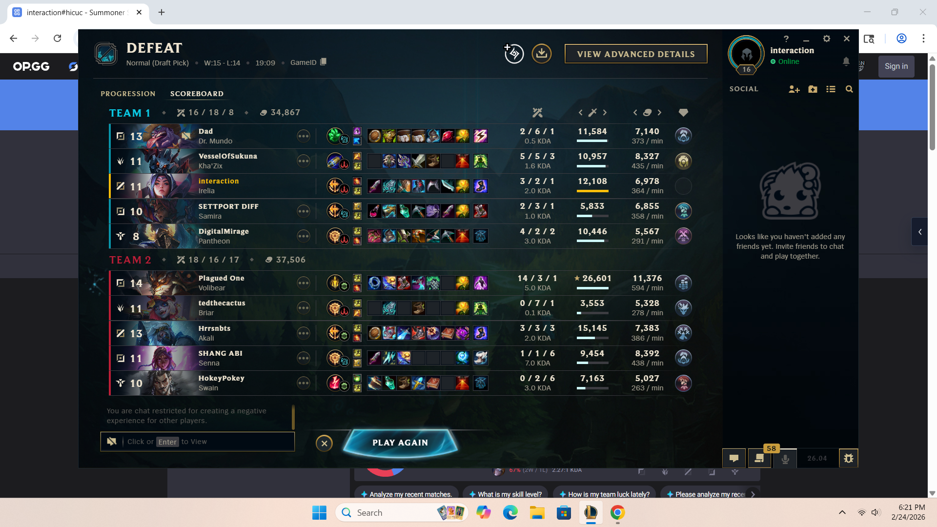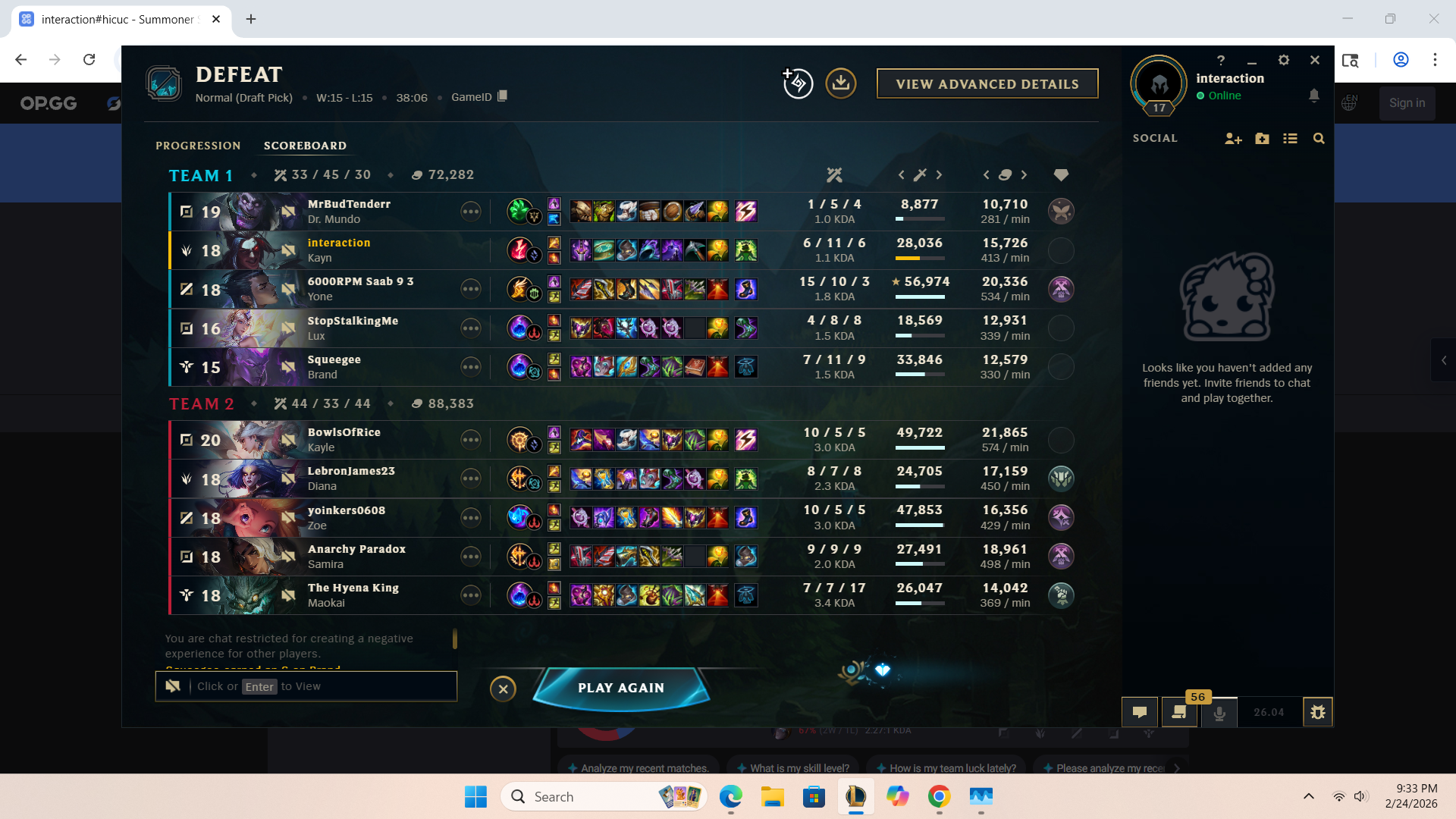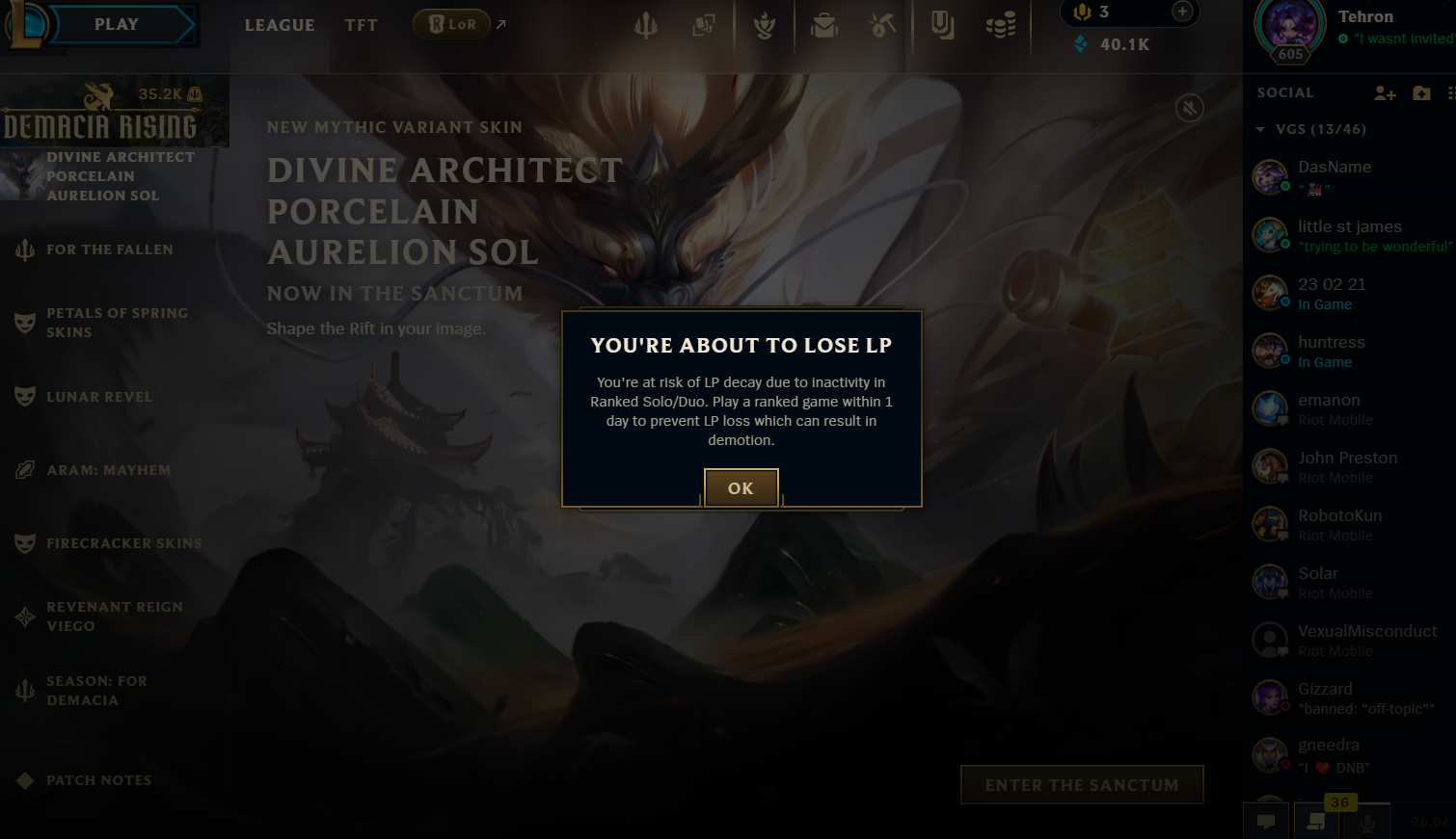 I might have to take a break or something, my first loss in ranked this season and I was in a emerald/high plat lobby. I usually beart Yasuo so hard so I fought him lvl 1 and proceeded to get raped the entire game by him and his duo jg. I also got my Kayn taken on my other account and got give the long end of the cane up the ass. Also chat banned till the 9th of March and 25 games to restore my honor 5.