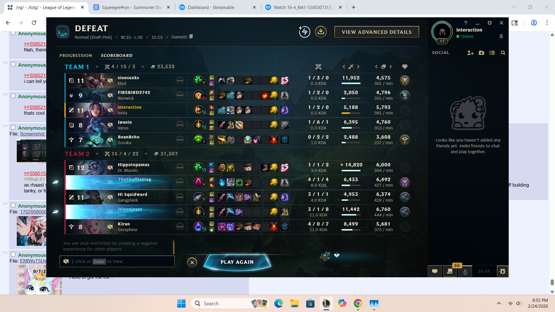 >>558505579>Shit sucks, I hate comeback games win or lose because I dont have the energy to do it everydayYeah thats why im inclined to ff games that seem lost, id rather just call it a loss and queue up another rather than spend the mental energy on a 45 minute game that could potentially be a crushing loss after trying to come back anyway