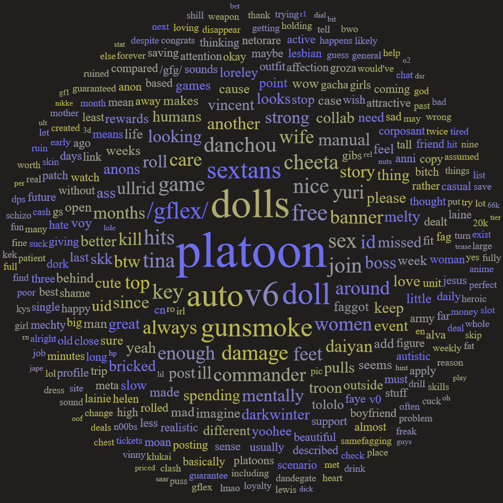 /gflex/ on Dorkwinter has one slot open! /gflex/ is a laid-back platoon with our only goal being to get all the platoon rewards. We have always been in the top 2% or above and we have a lot of V6 dolls available to use. We are looking for active anons who will do their dailies/hits. If this sounds up your alley then please apply with /gflex/ in your profile! If you have any questions feel free to add me.
