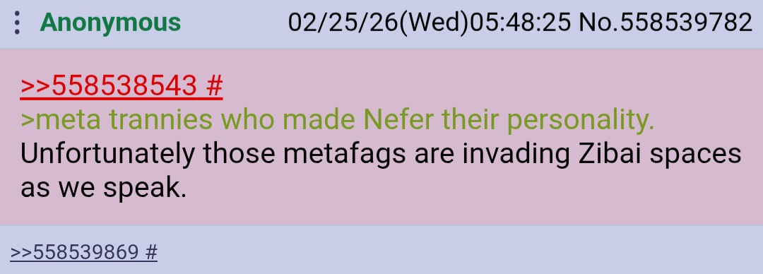 >>558538474Allows Zibai to drop a nice steamy shit down the throat of meta trannies who made Nefer their personality.