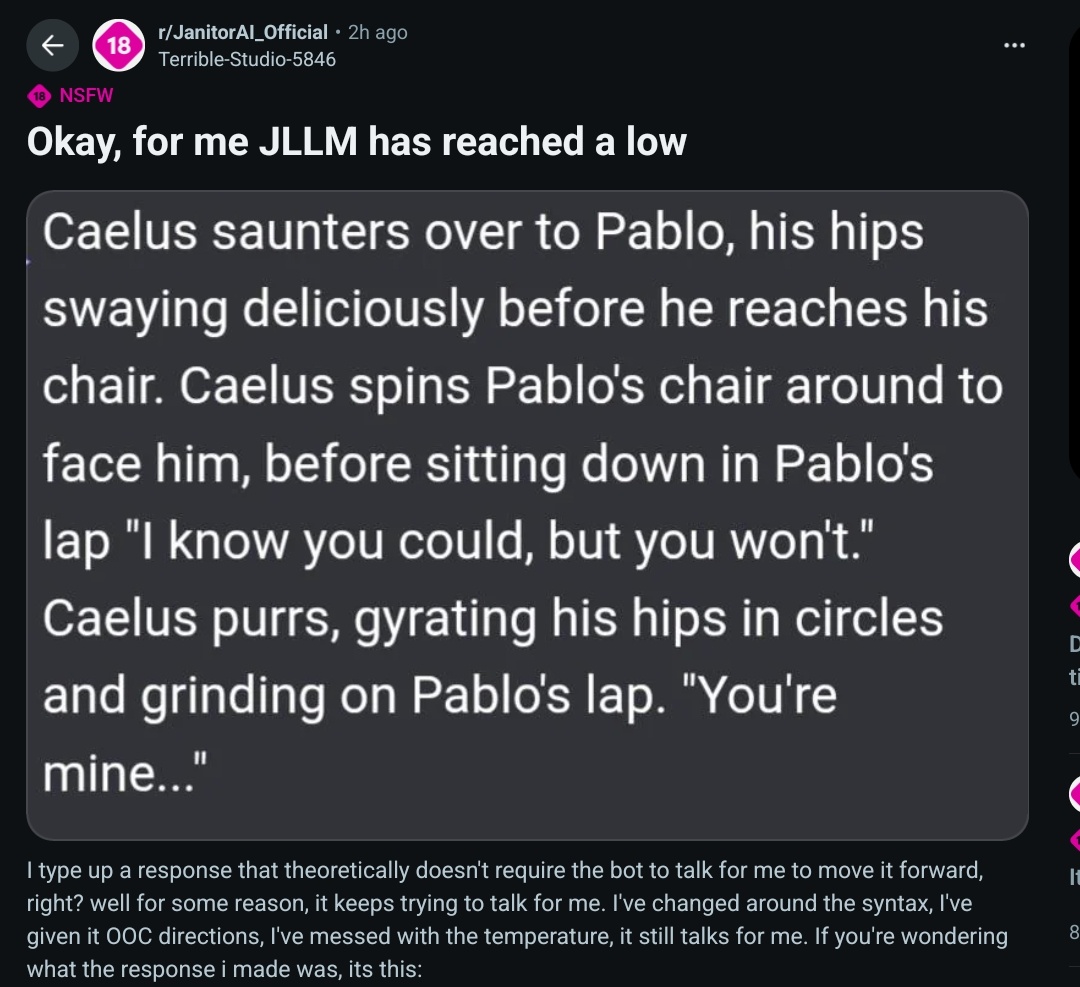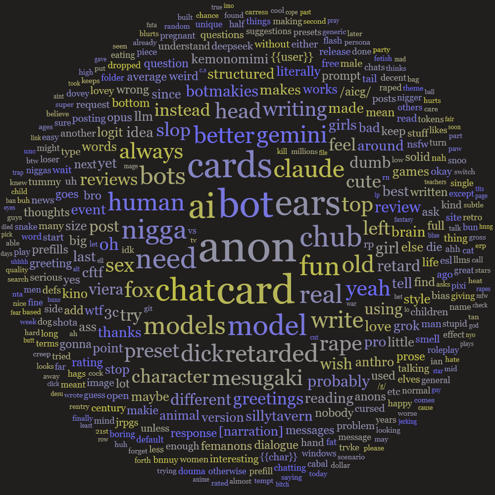 >>558553037its a combo of a lot of things>numodels are slopped>aicg is more hostile and discordfaggy than ever which means that people are less likely to do what they in the past and be open with what they’re chatting with and about >proxy era is over and free access to corpo models is a pipe dream though even if it were not, see the first point We really need an excellent model. It might not be anything to you if you are relatively new to the hobby but for those of us who have been chatbotting almost daily since 2022 what we have now is impressively disappointing